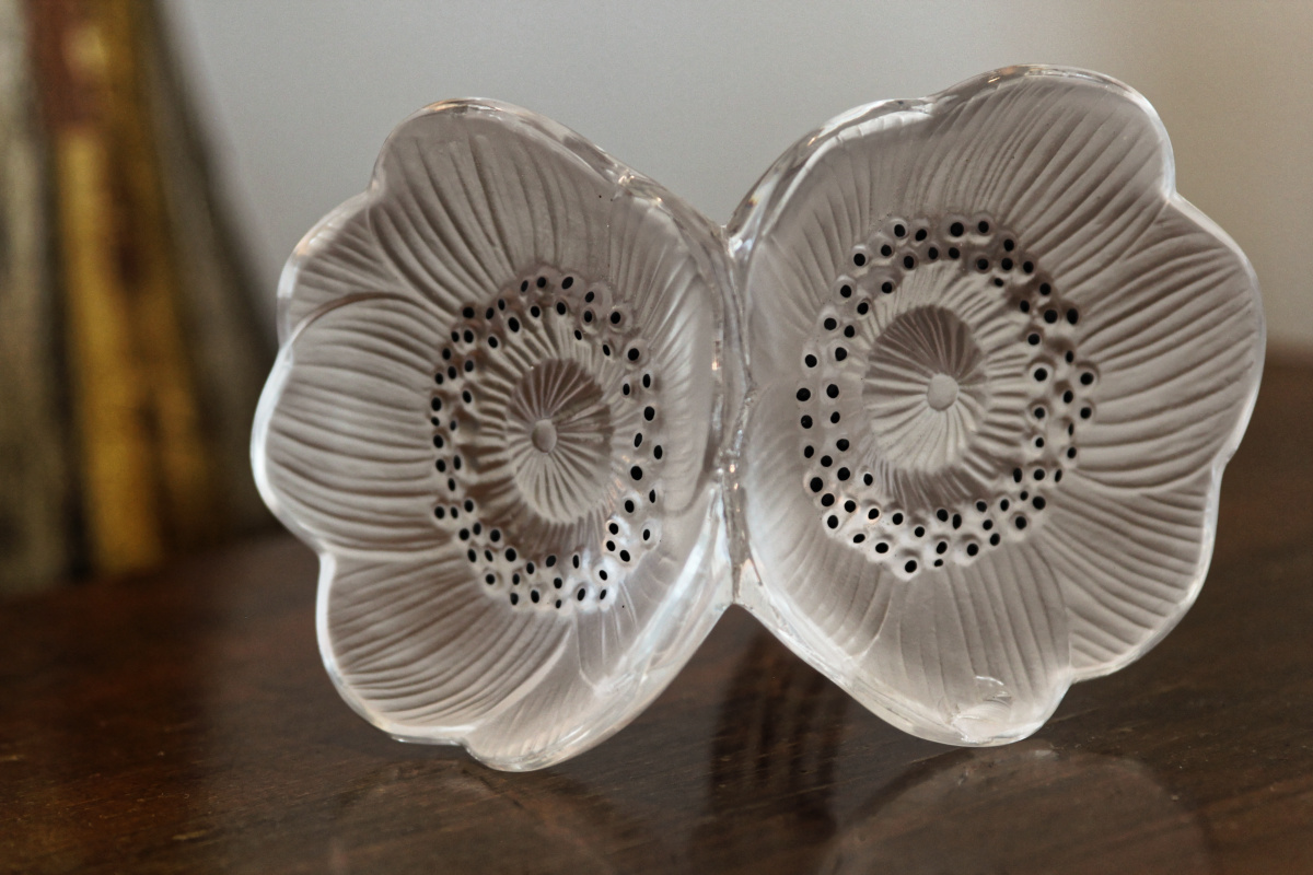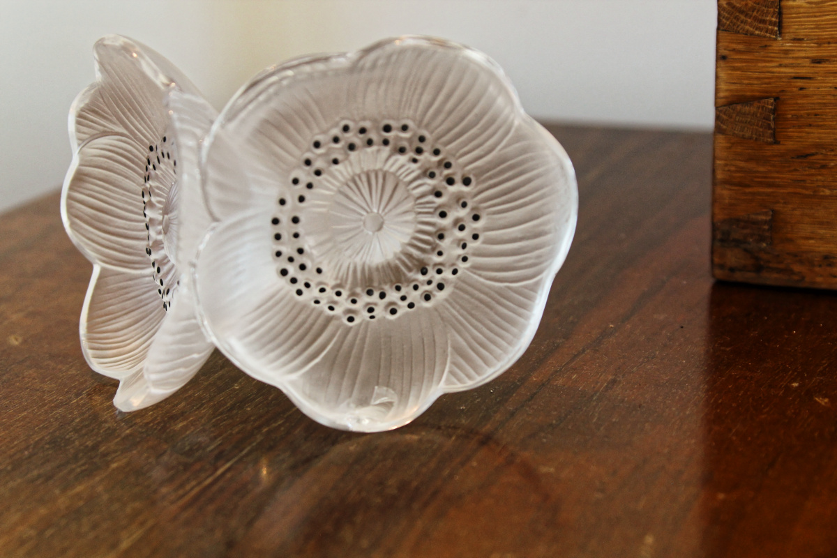 Bouchon Lalique signé, anémone double en cristal