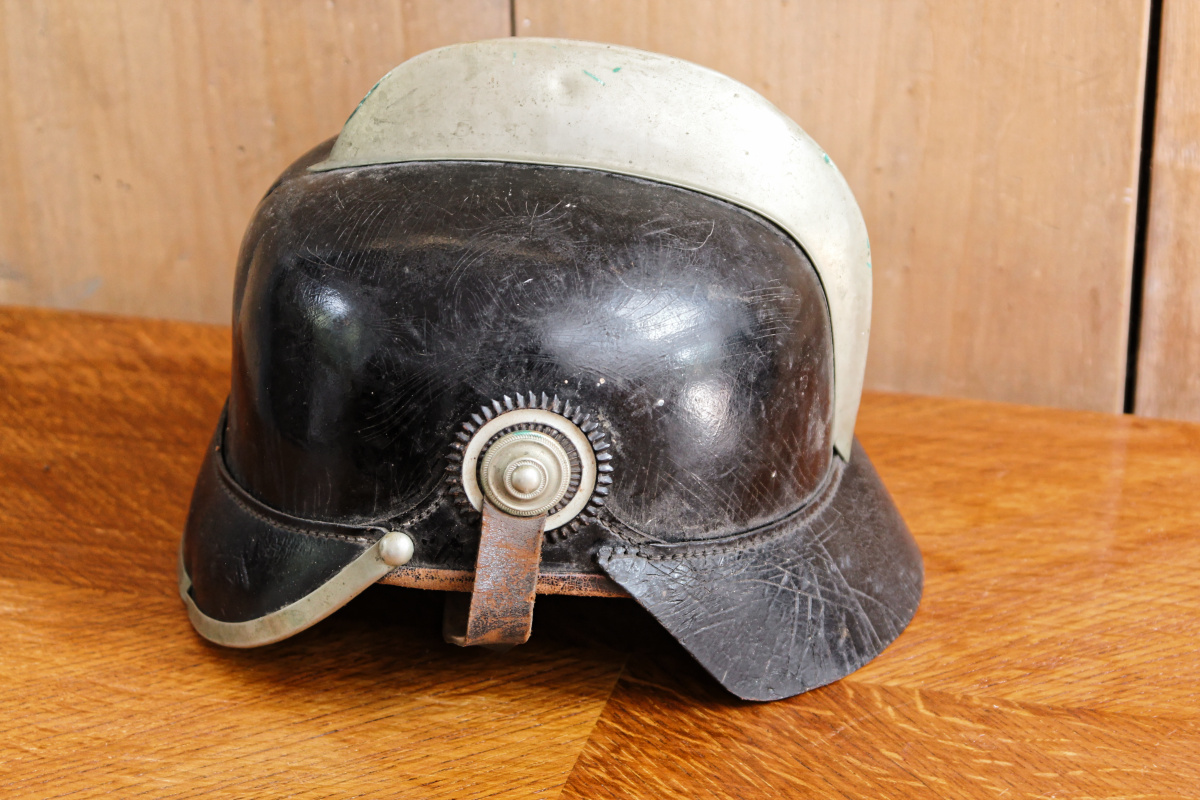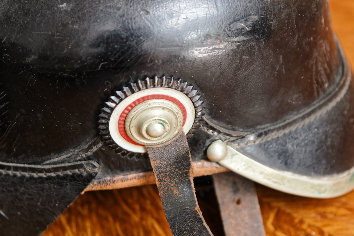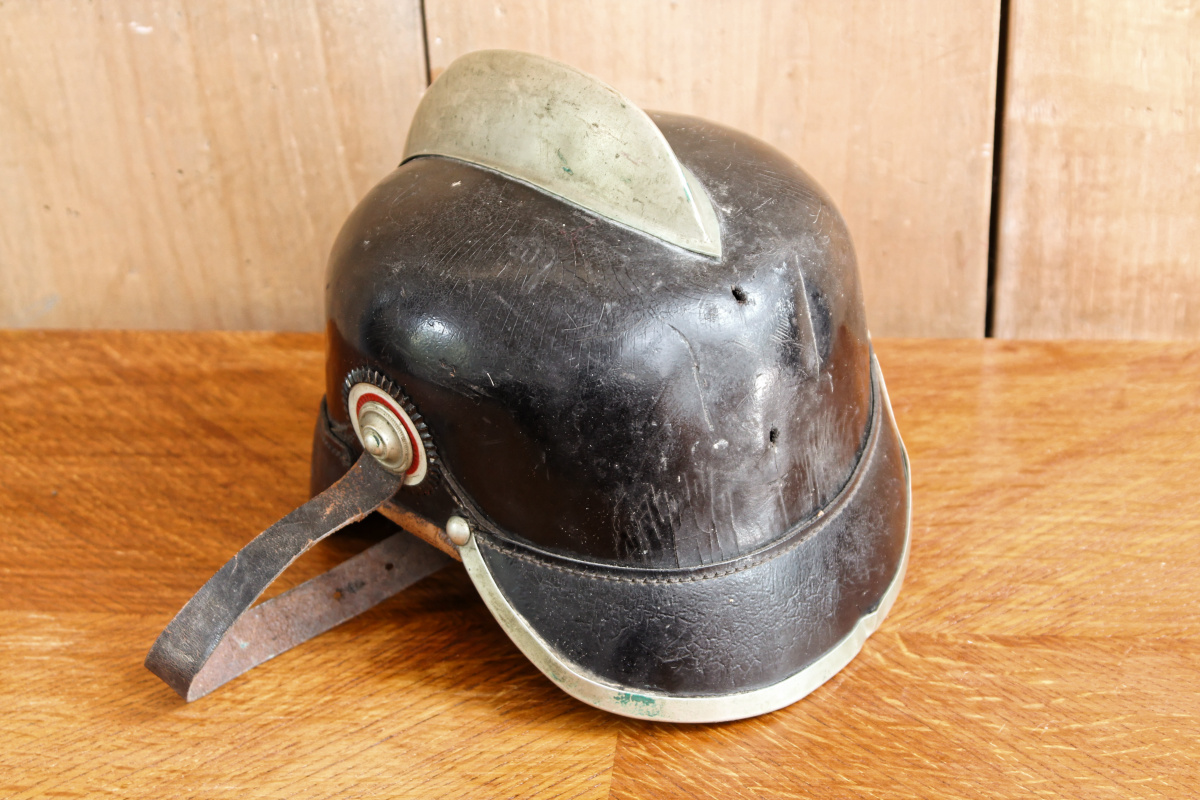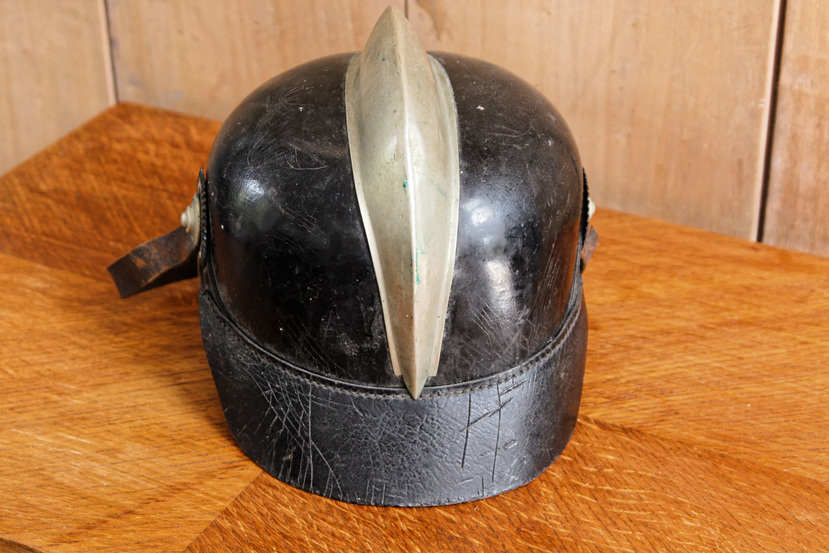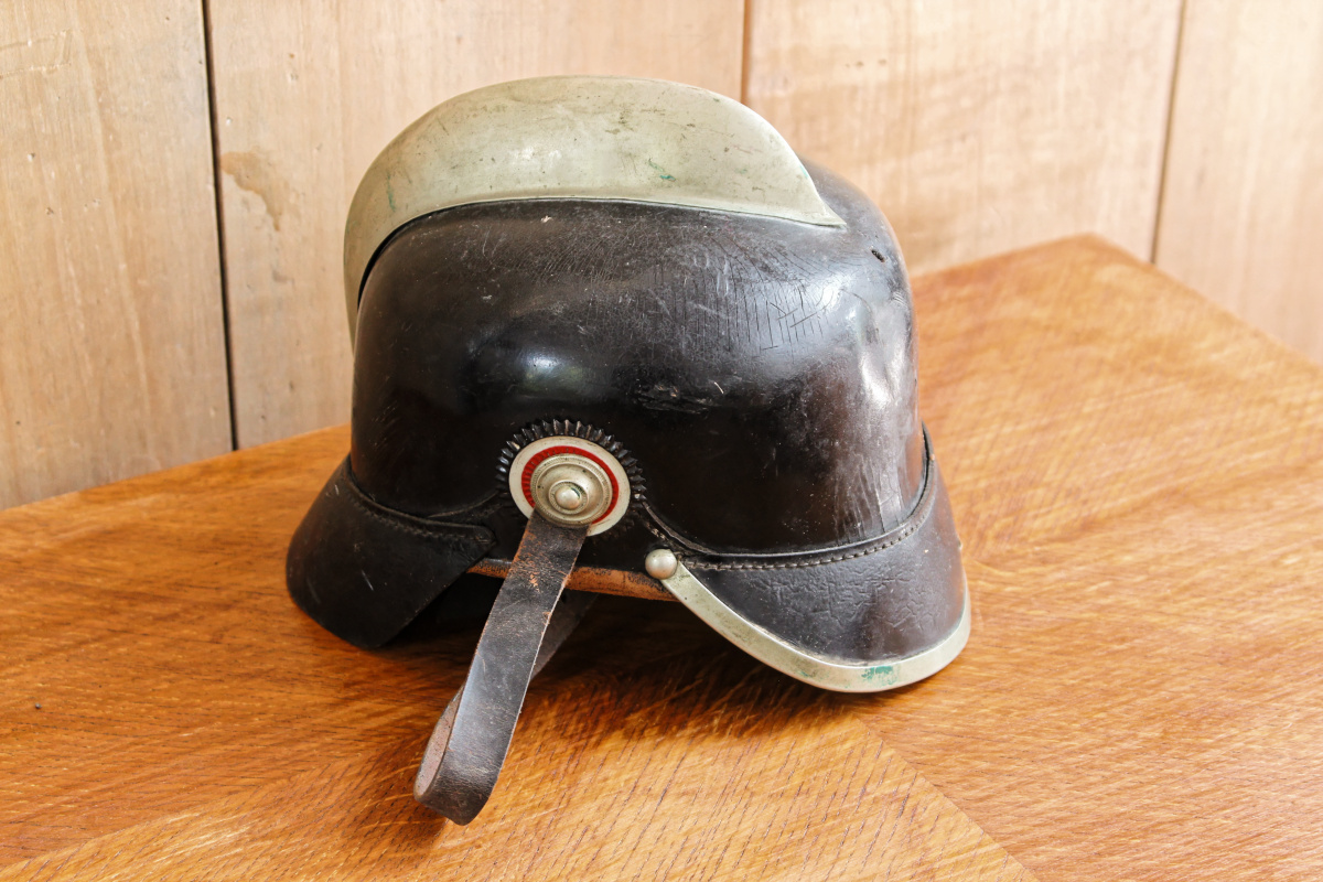 Casque de sapeur pompier, empire allemand, en épais cuir vernis noir, cimier et jonc en métal blanc nickelé, cocardes peintes en tôle, jugulaire en cuir noir, coiffe intérieure en cuir fauve à 9 dents. Etat d'usage, une vraie curiosité.