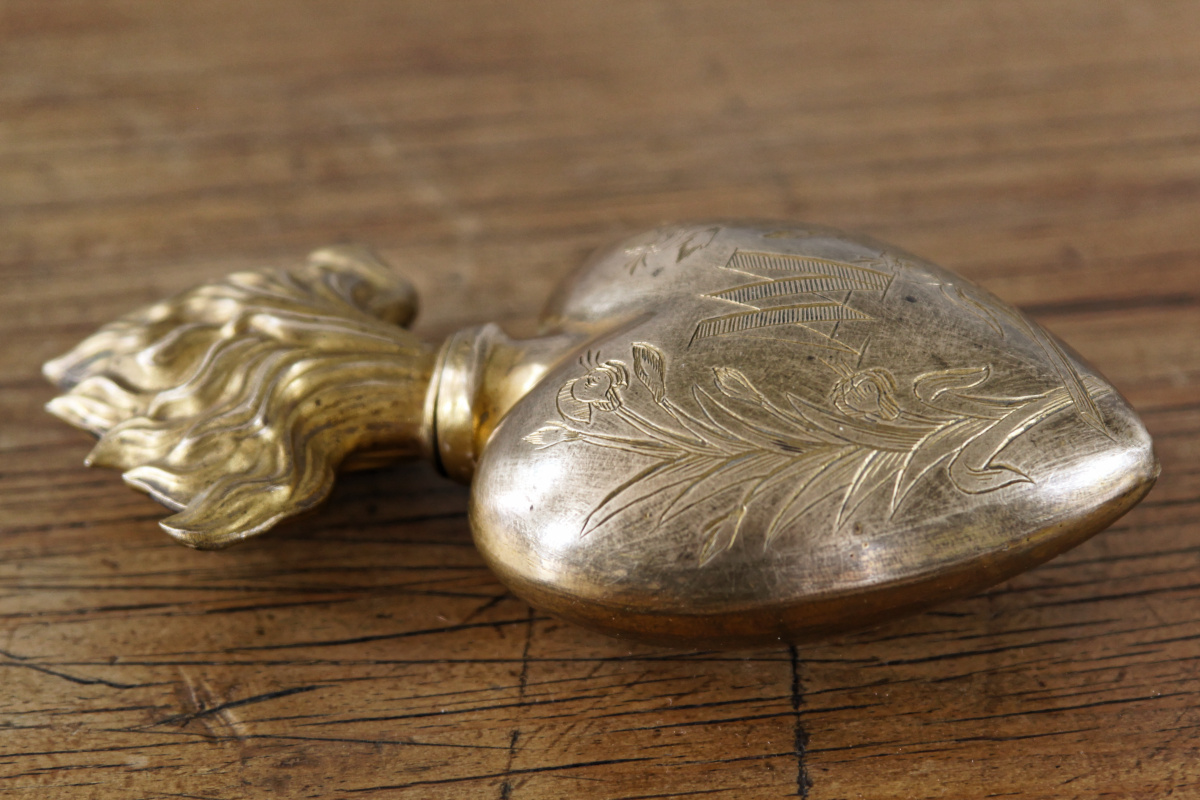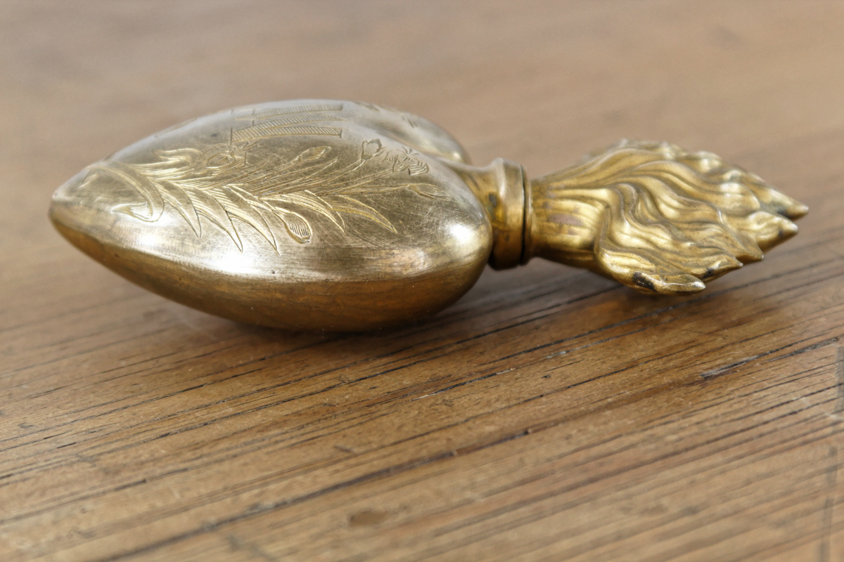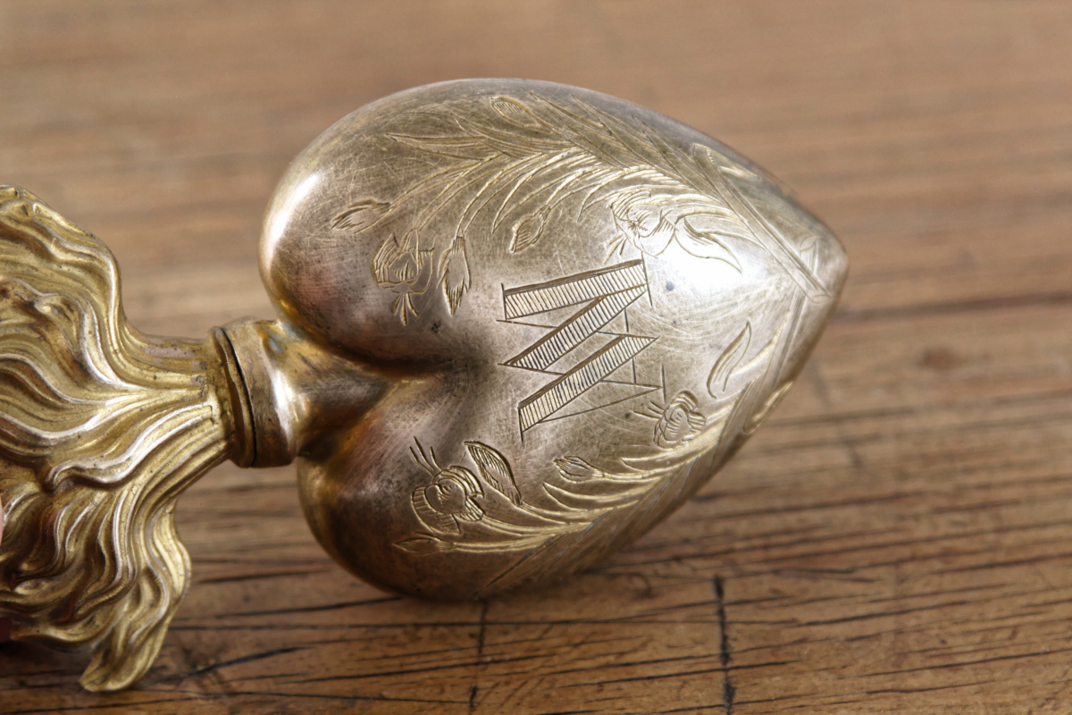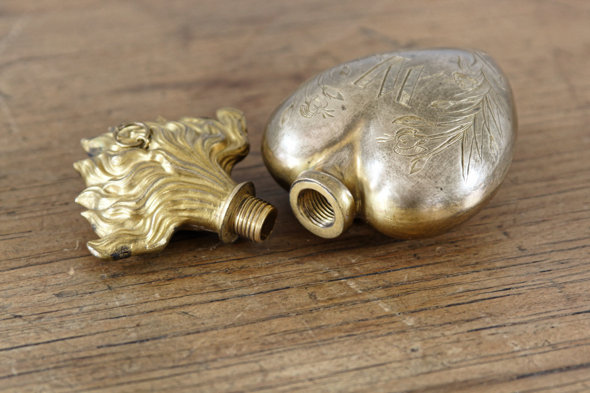 Rare et très bel exemplaire de "gourde" à eau bénite en laiton, monogramme AM (Ave Maria). Un objet de dévotion délicat et très décoratif en très bon état général.