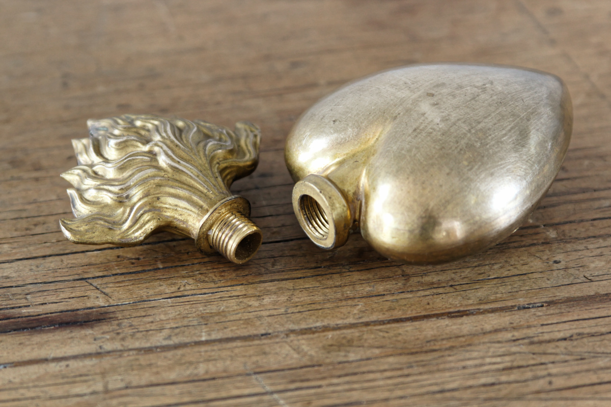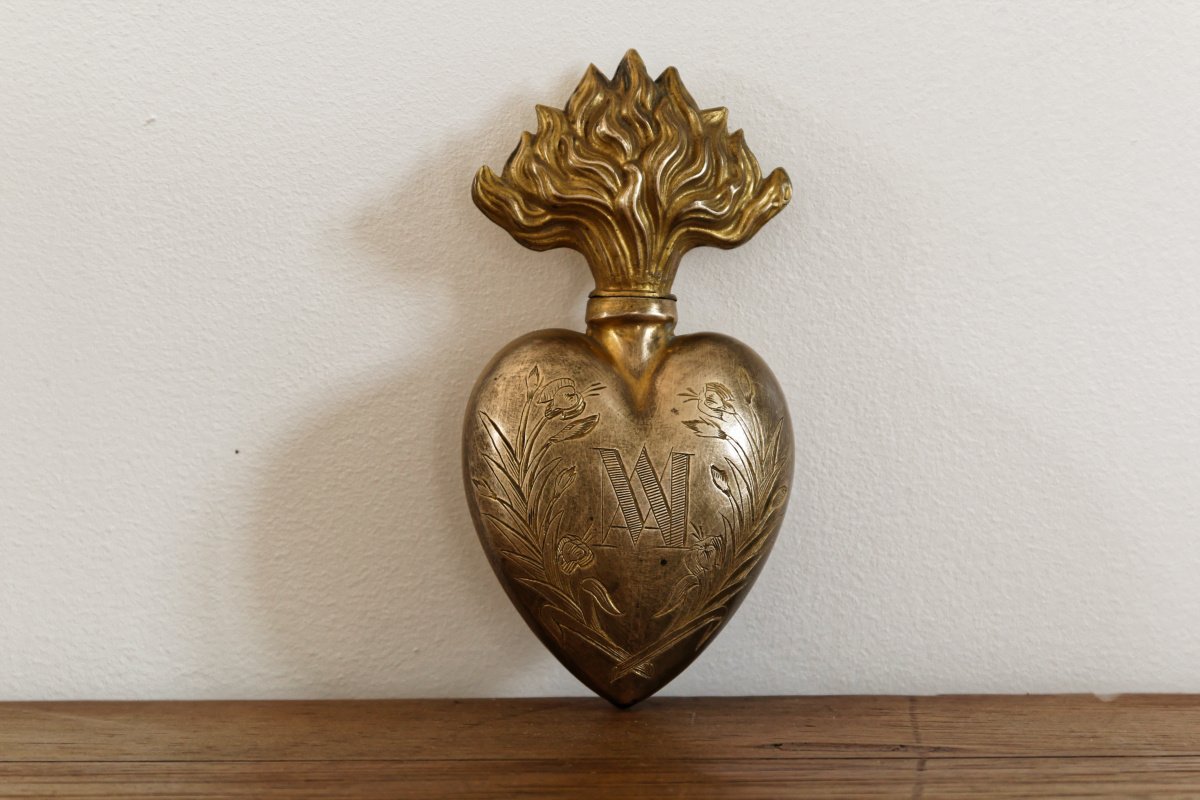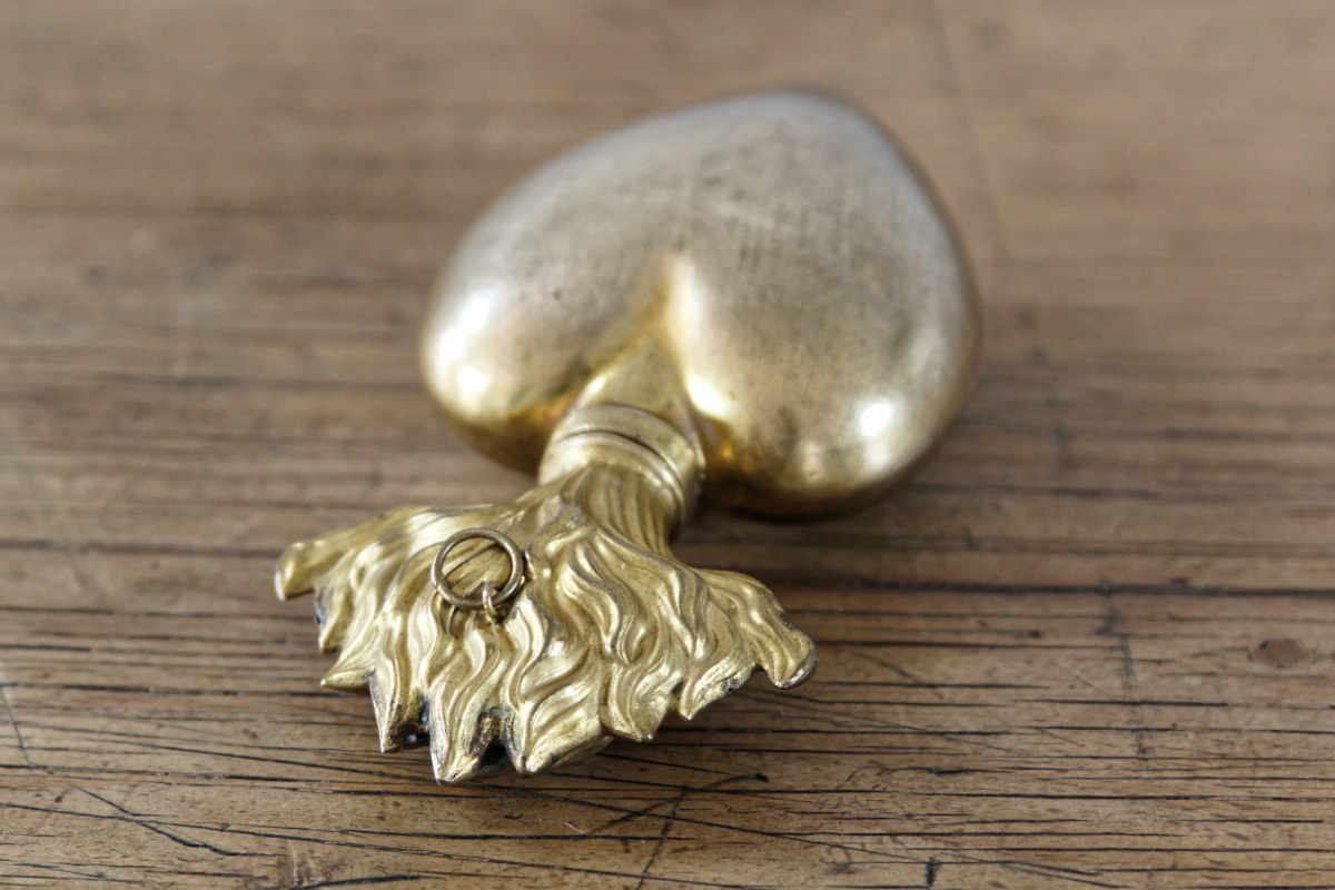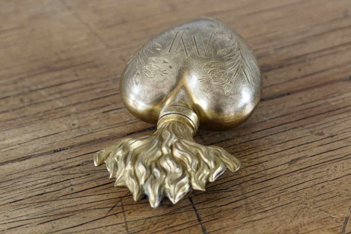 Rare et très bel exemplaire de "gourde" à eau bénite en laiton, monogramme AM (Ave Maria). Un objet de dévotion délicat et très décoratif en très bon état général.