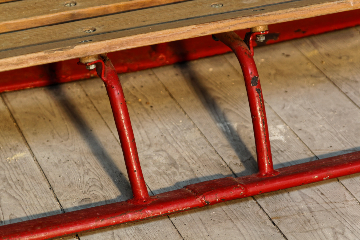 En bois brut et métal rouge