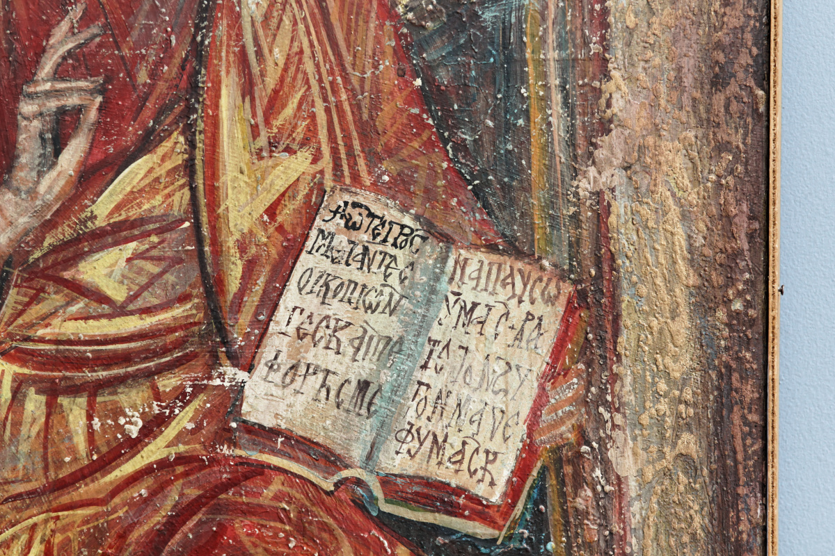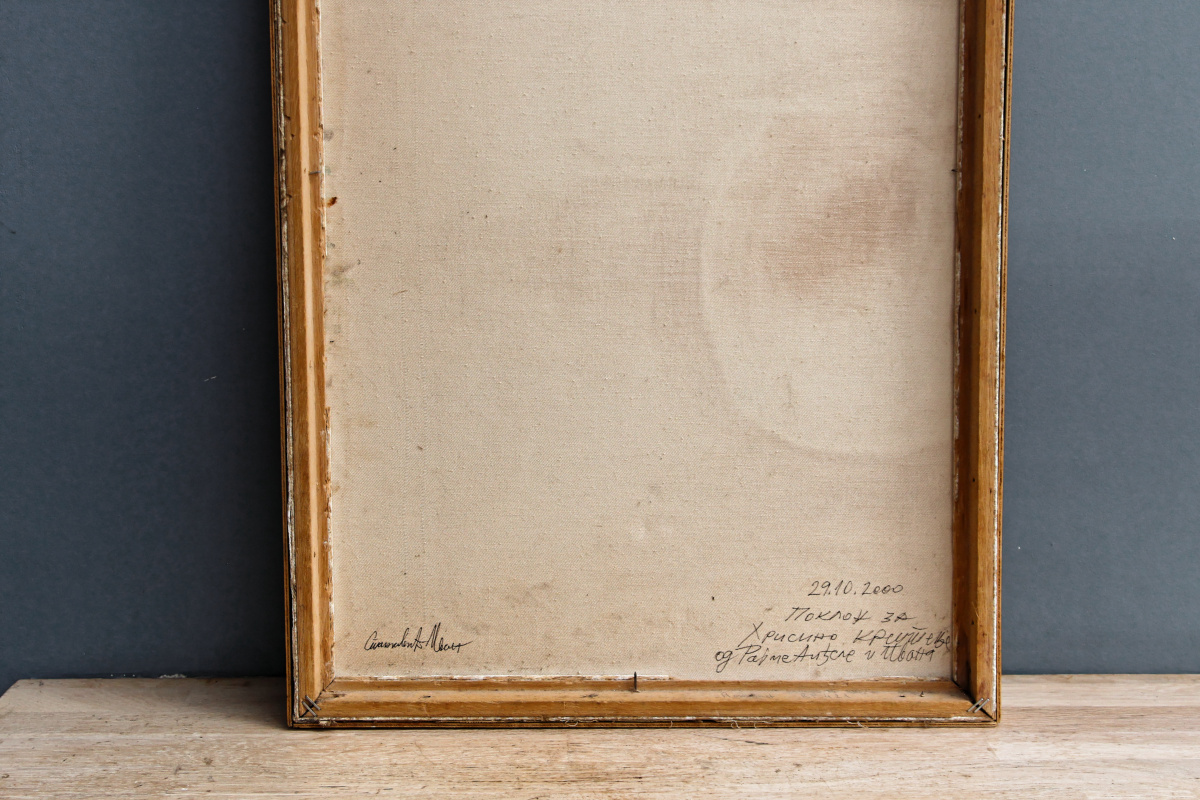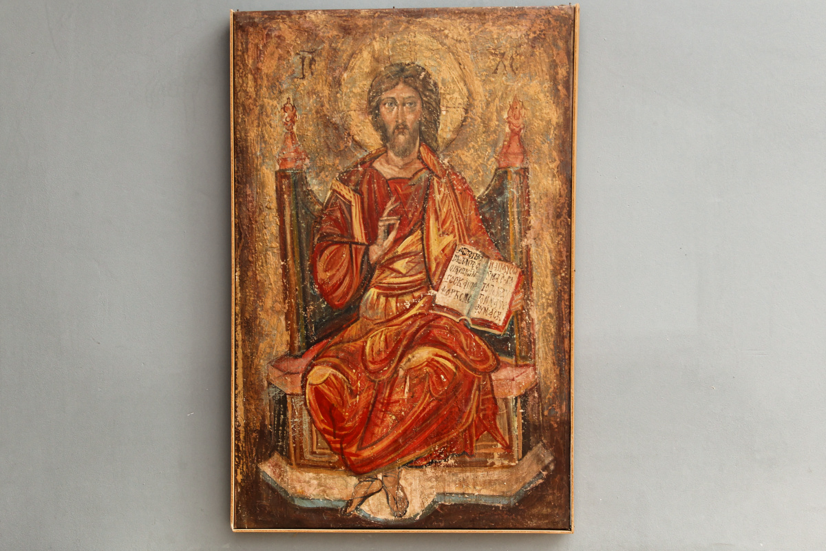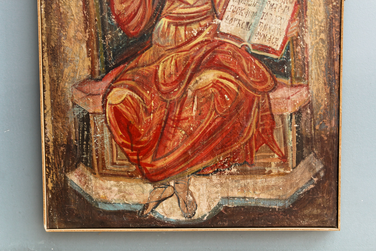 Superbe huile sur toile, signée, datée, représentant le Christ Pantocrator. Bon état général, il manque juste une baguette de bois en haut. Couleurs vives, beaucoup de présence et de lumière.