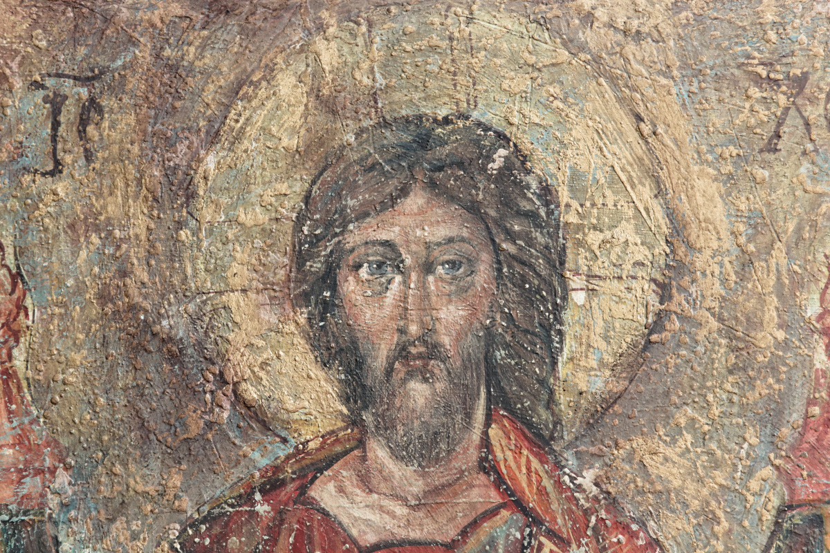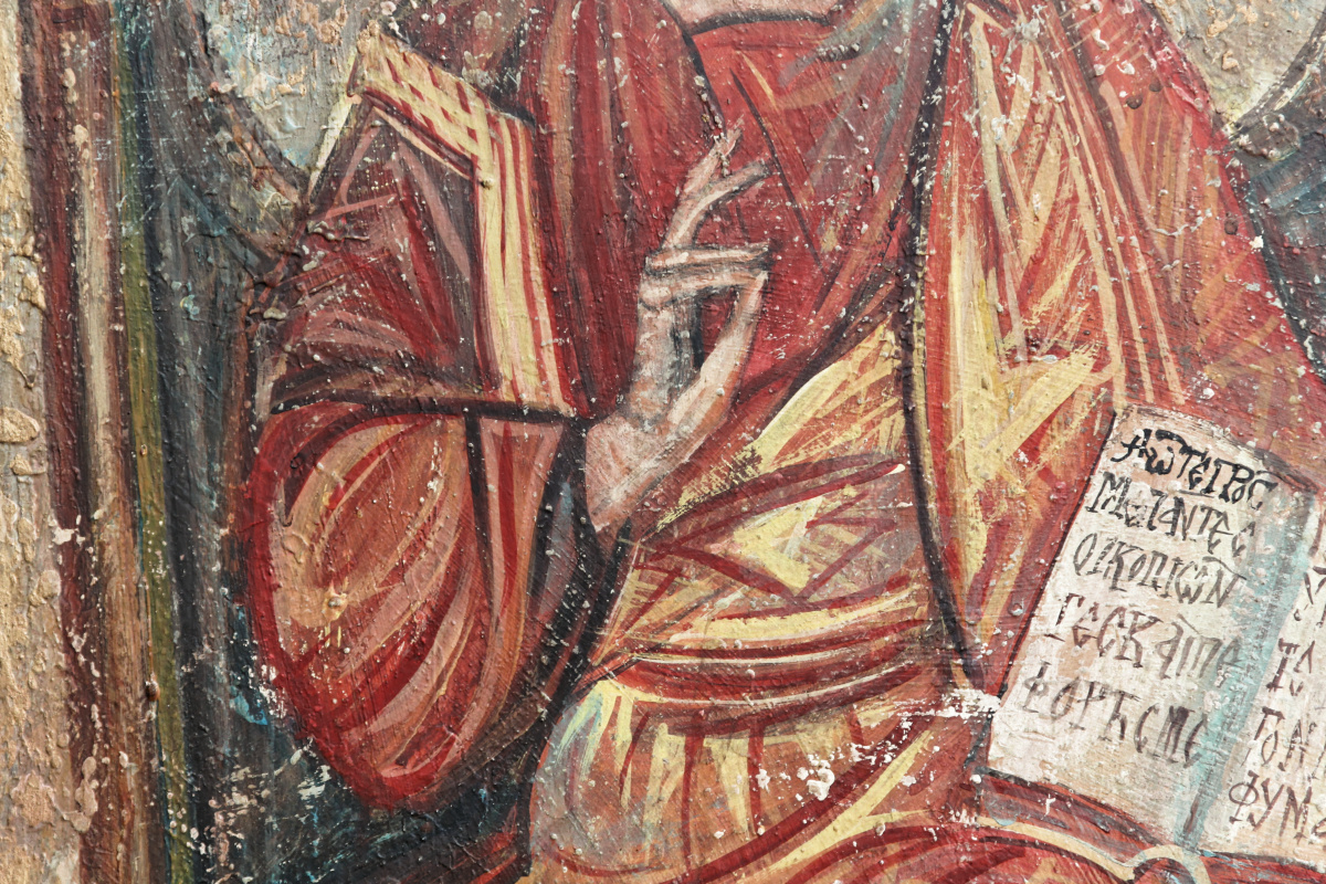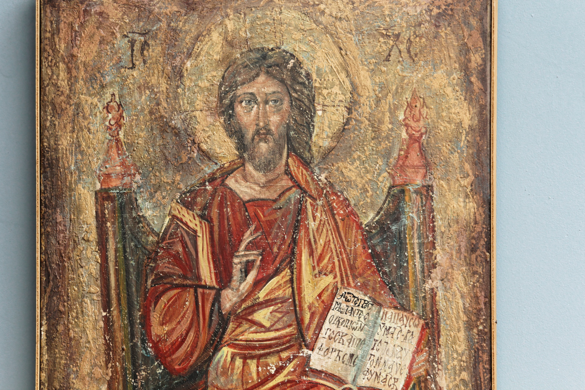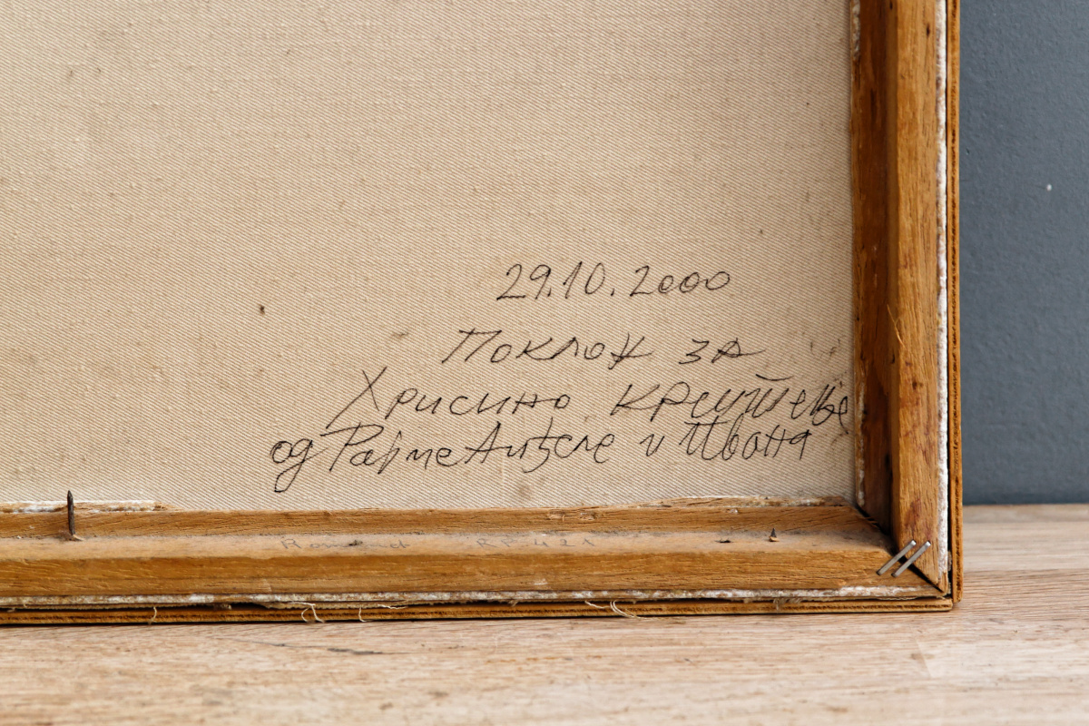 Superbe huile sur toile, signée, datée, représentant le Christ Pantocrator. Bon état général, il manque juste une baguette de bois en haut. Couleurs vives, beaucoup de présence et de lumière.