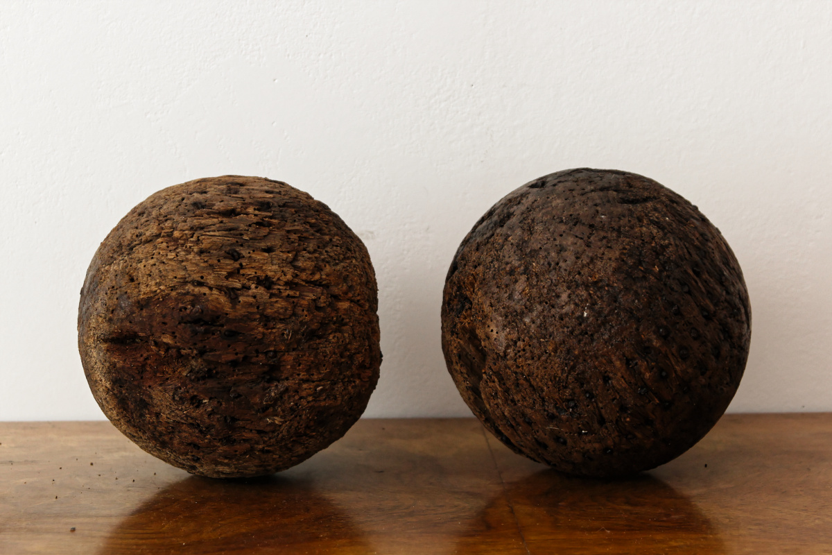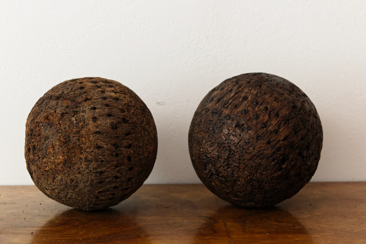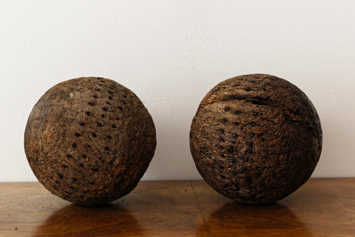 Lot de deux boules cloutées en bois, issues d'un ancien jeu picard du XIXème siècle. Complètement dans leur jus elles ont été traitées contre les insectes xylophages. De bonne taille, elles constituent un élément de choix pour la décoration, patinées et usées par les années.