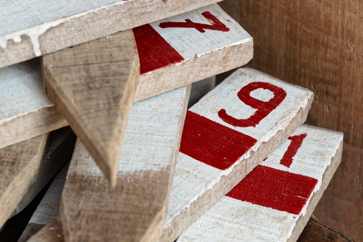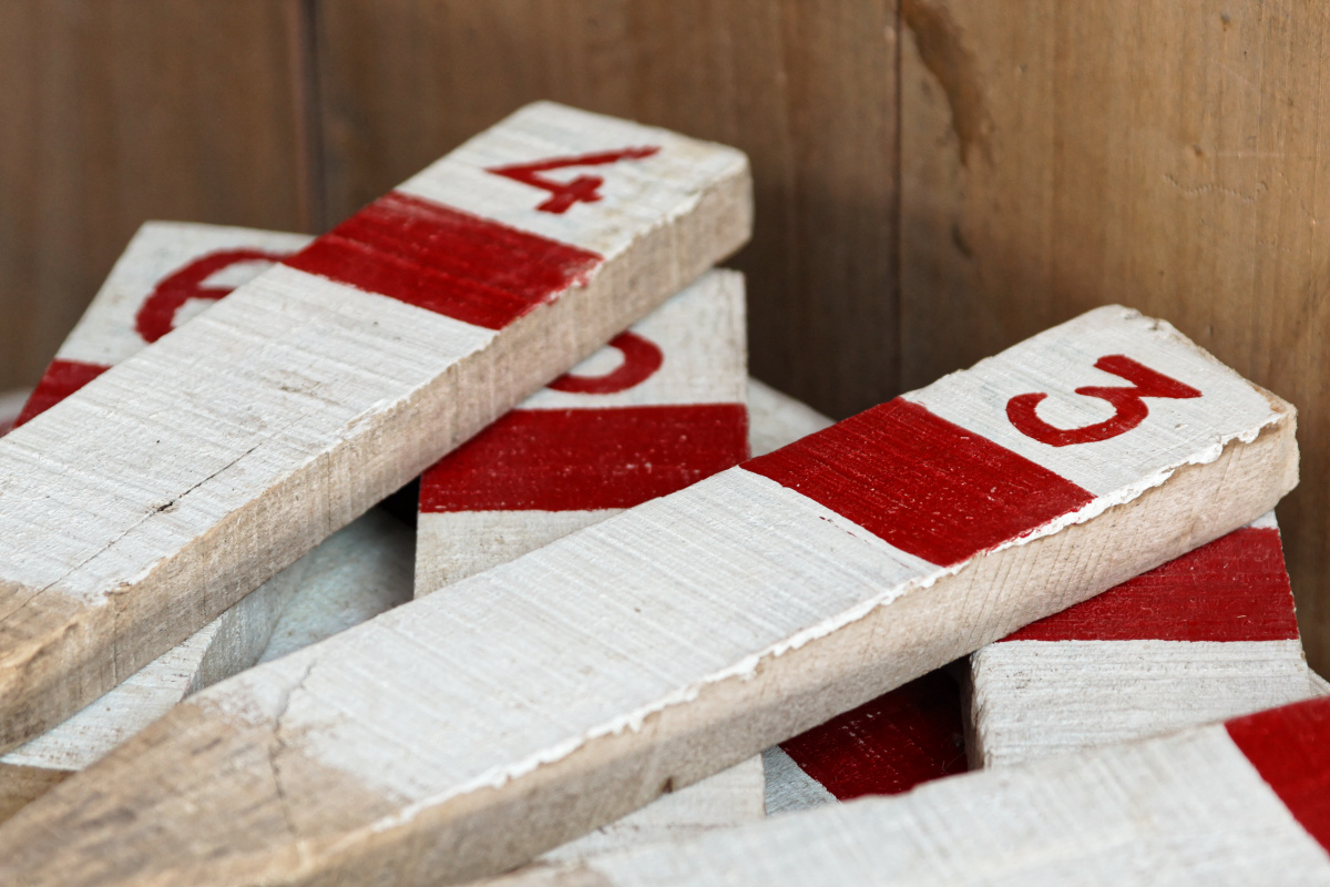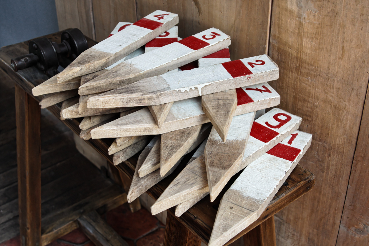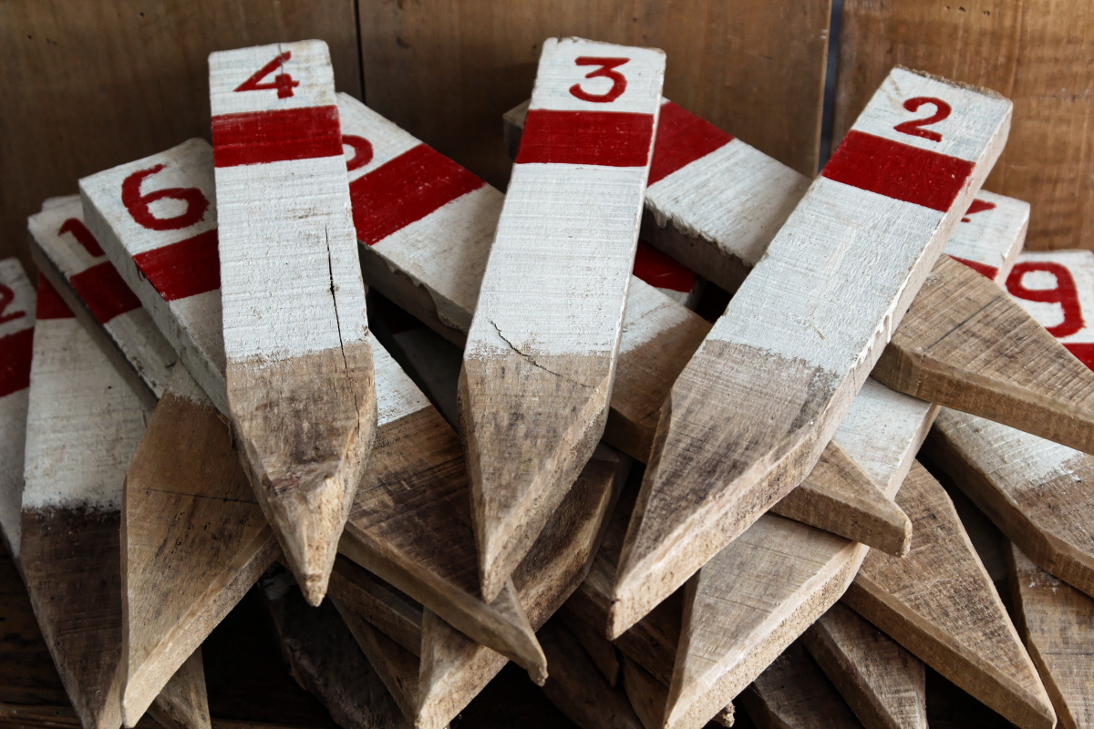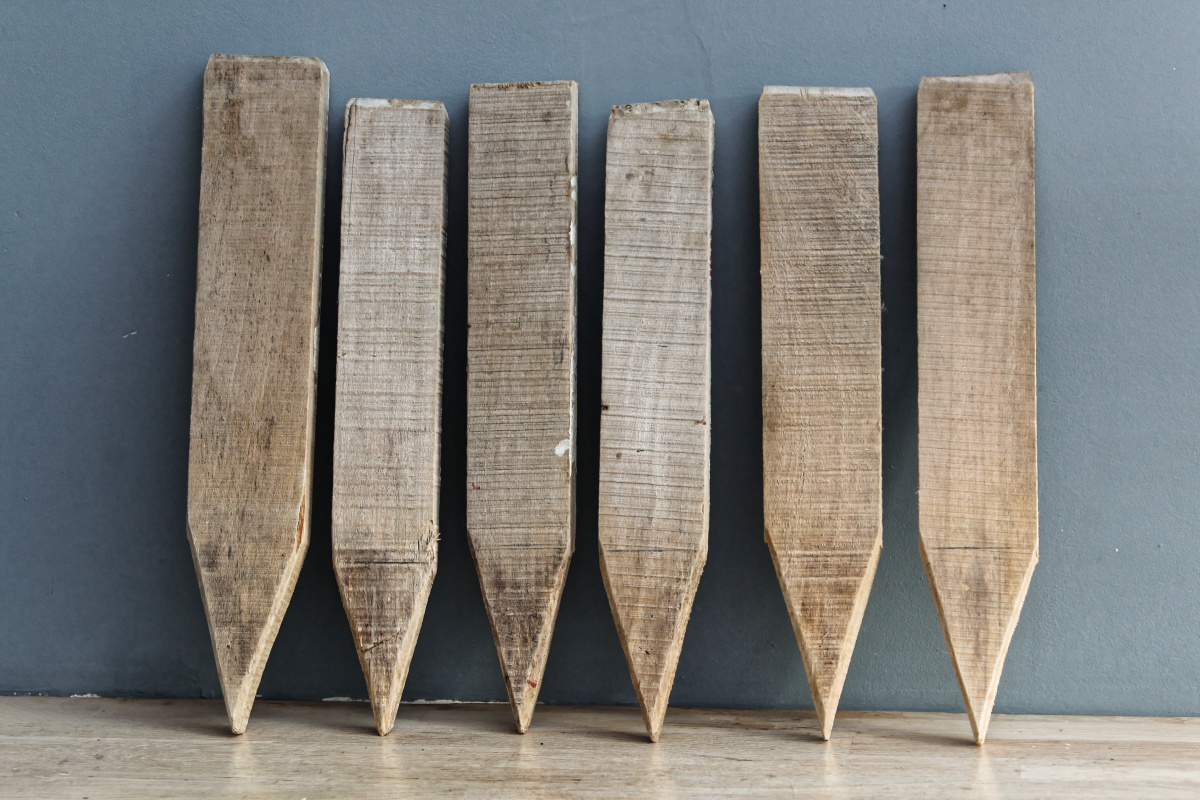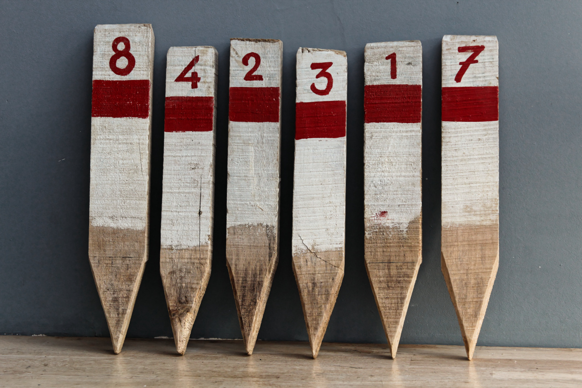Une très belle série de repères en bois, des années 40-50, qui servaient dans les champs de betteraves de l'Oise à délimiter les parcelles pour les saisonniers. On peut envisager une reconversion, pour un concours de lancer de pépins de raisins, un lancer de poids ou autre... Beaucoup de charme en décoration également.