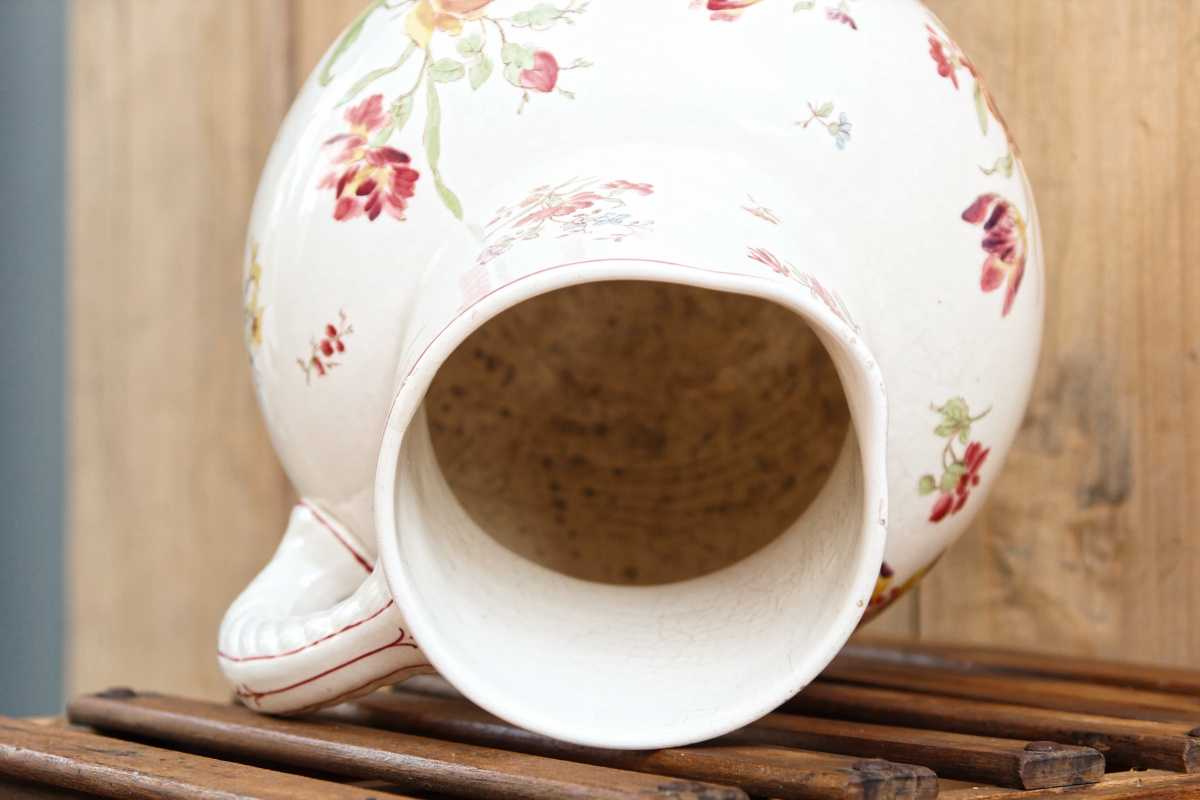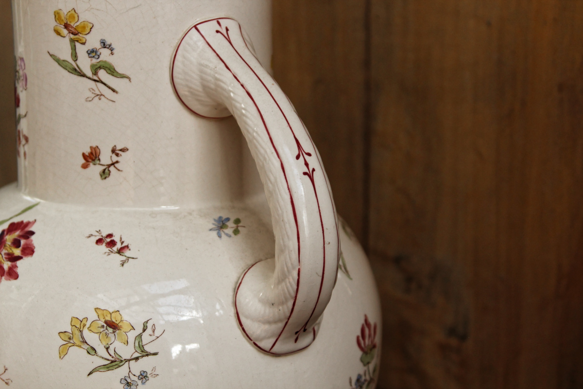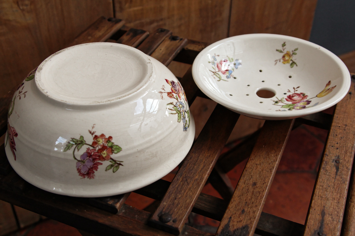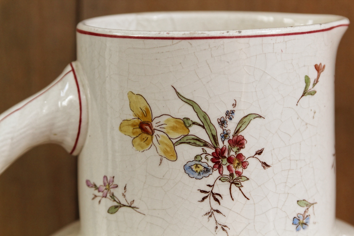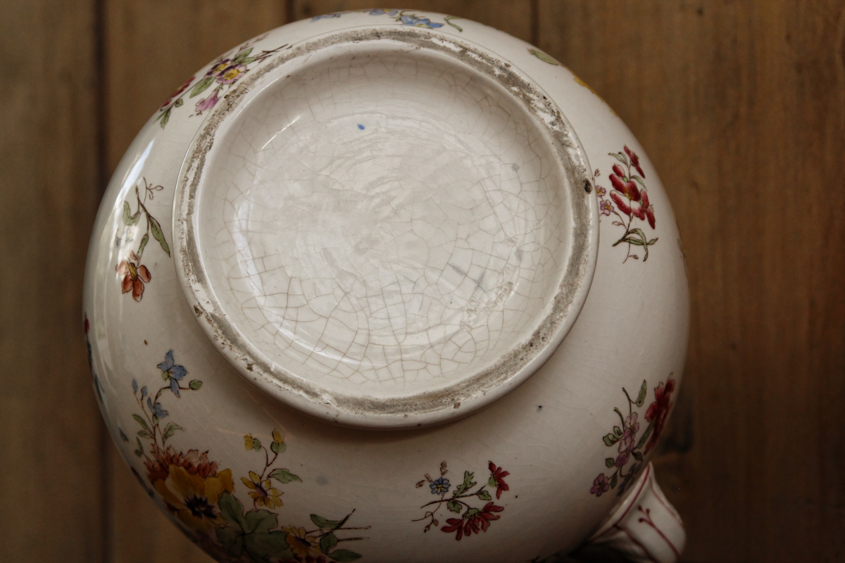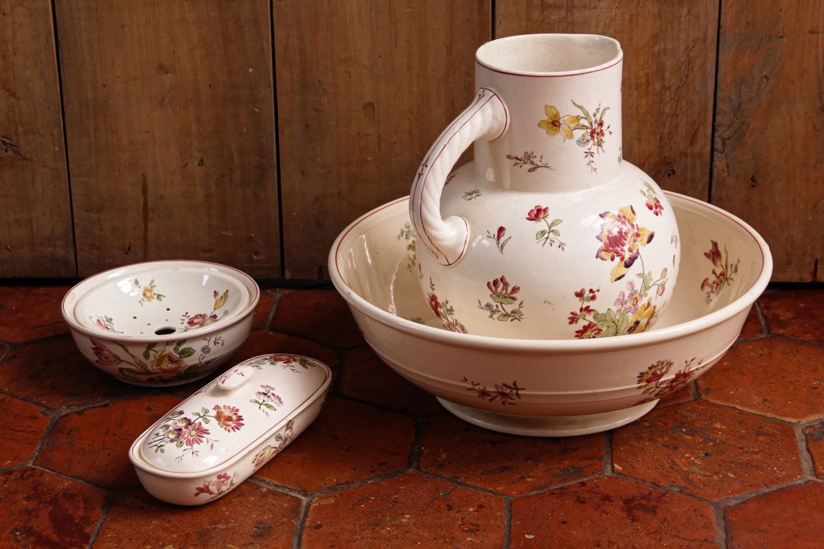 Très bel ensemble, composé de 4 éléments en faïence, aux motifs floraux d'une grande fraicheur et d'une grande finesse. Production française, quelques chocs, fêle (voir photos), qui n'enlèvent en rien la grande qualité de cet ensemble qui décorera à merveille une salle de bain, une chambre d'hôte...