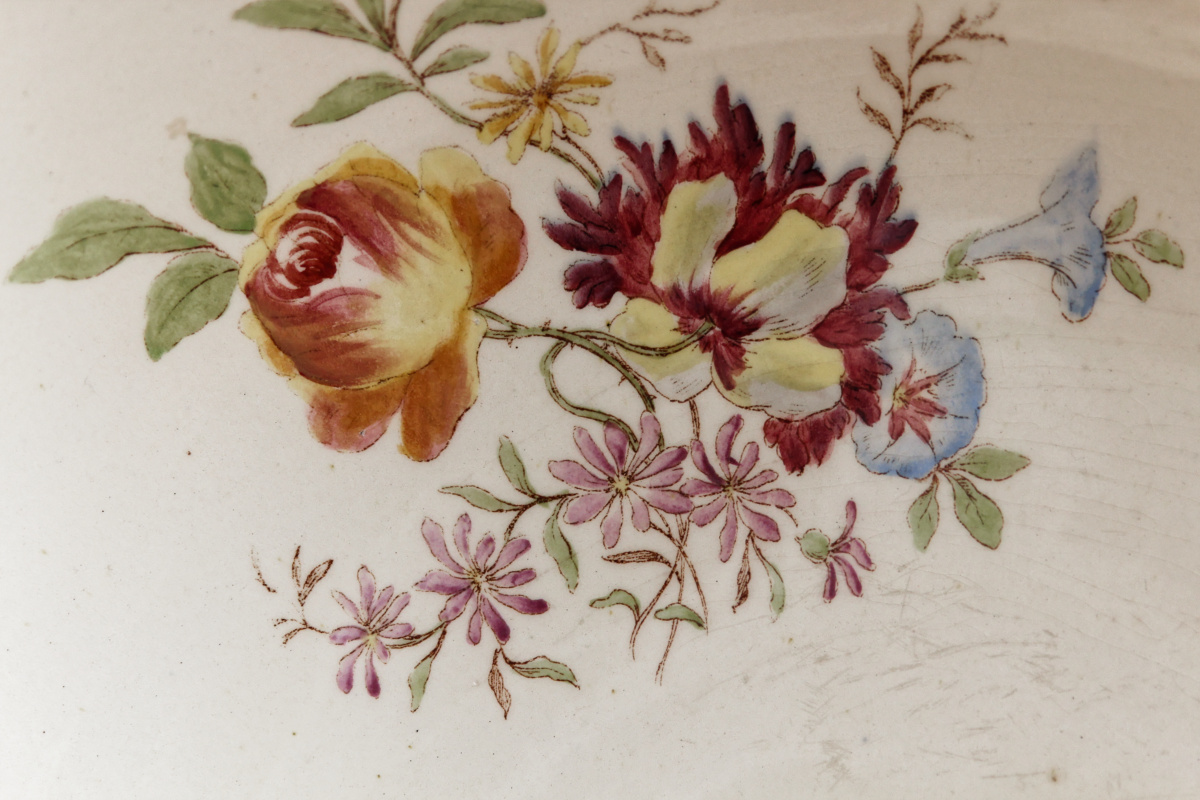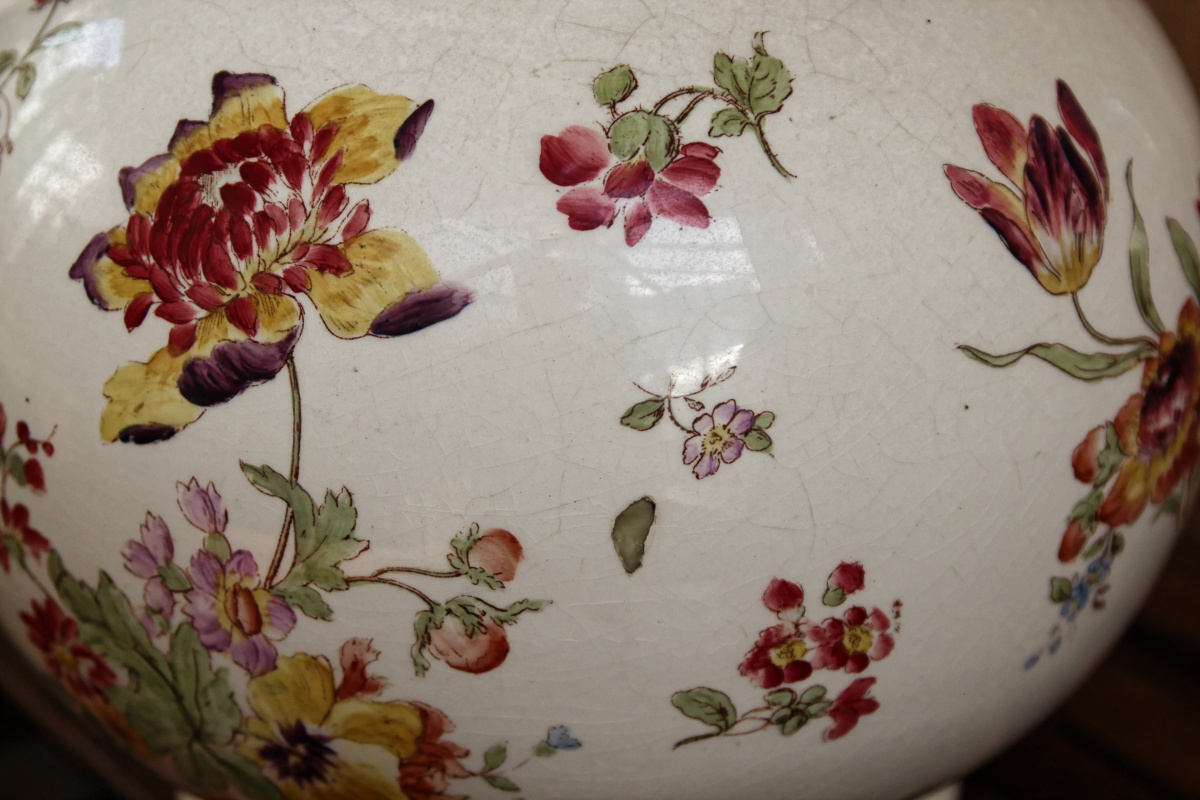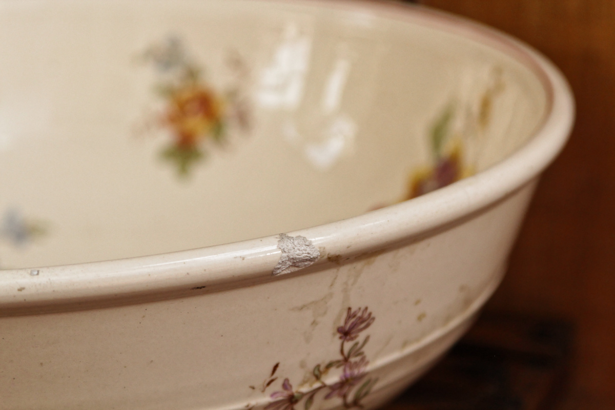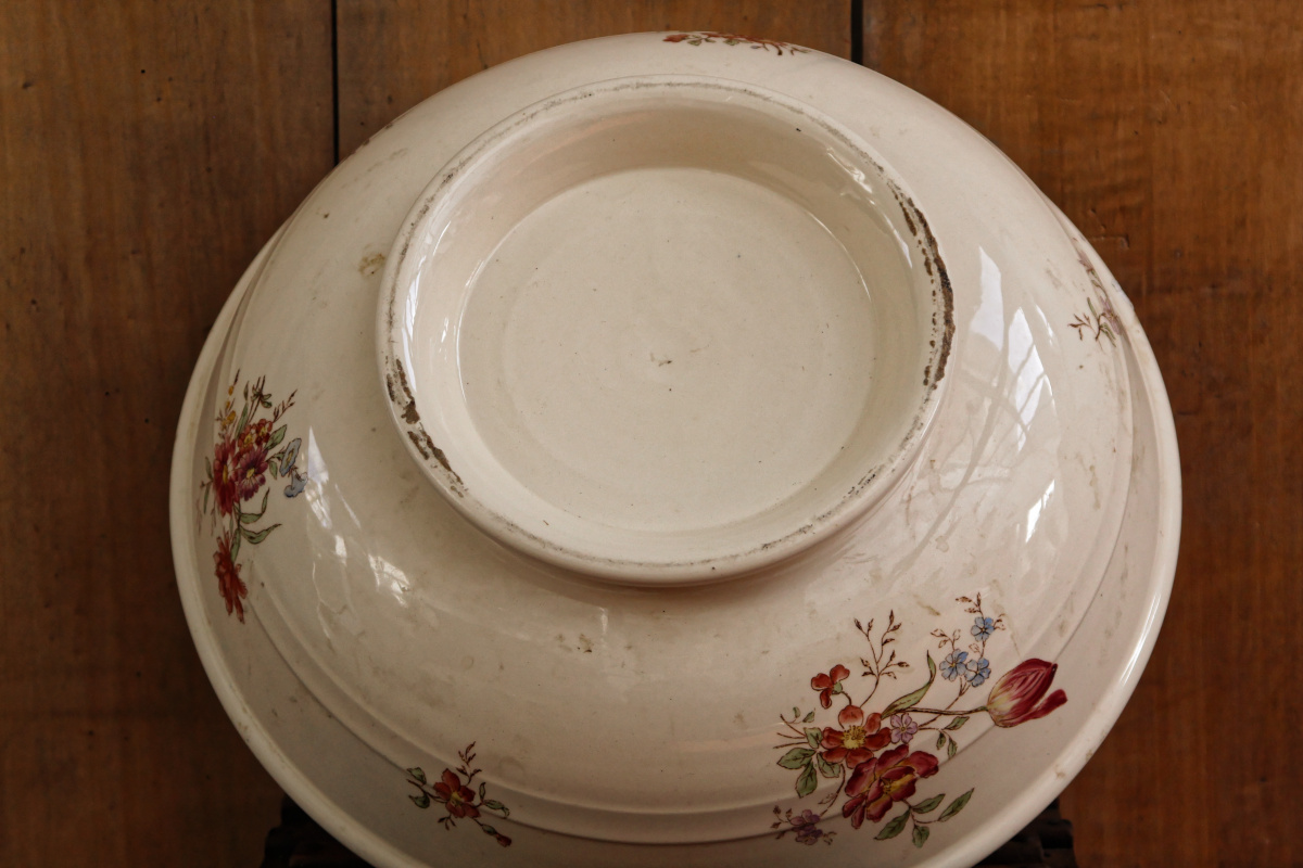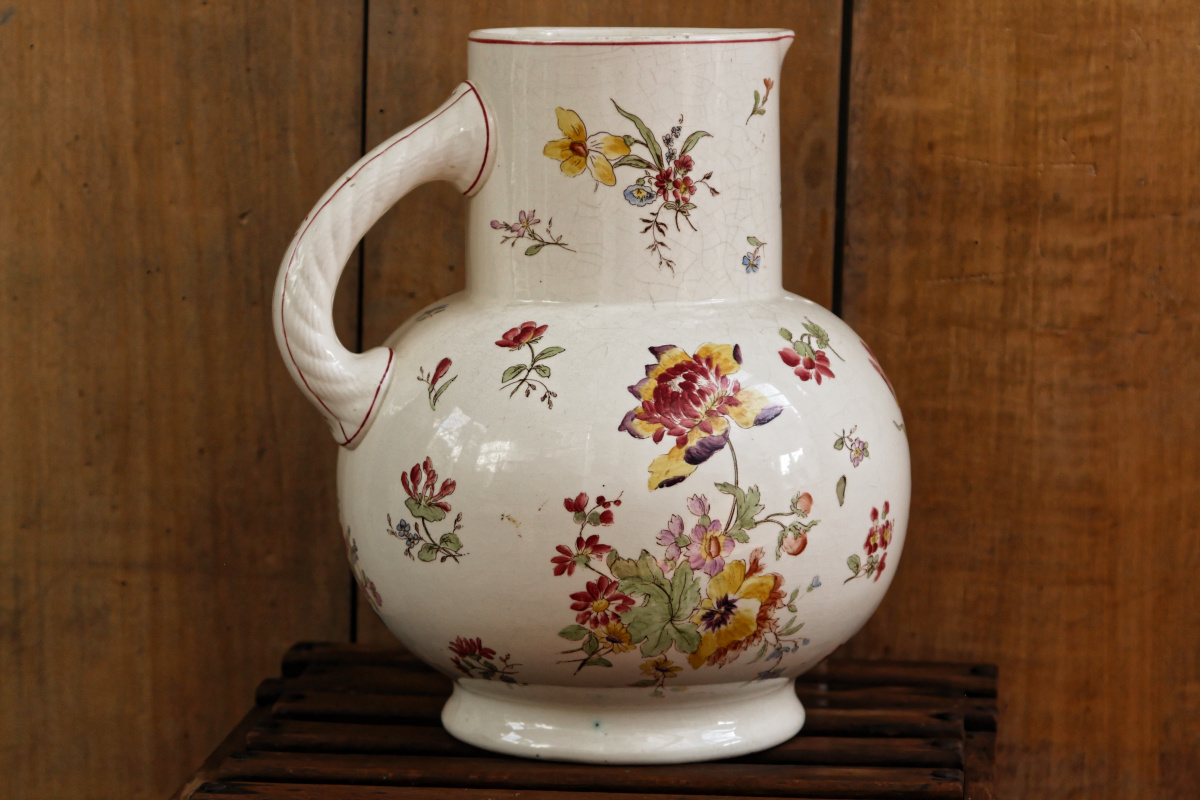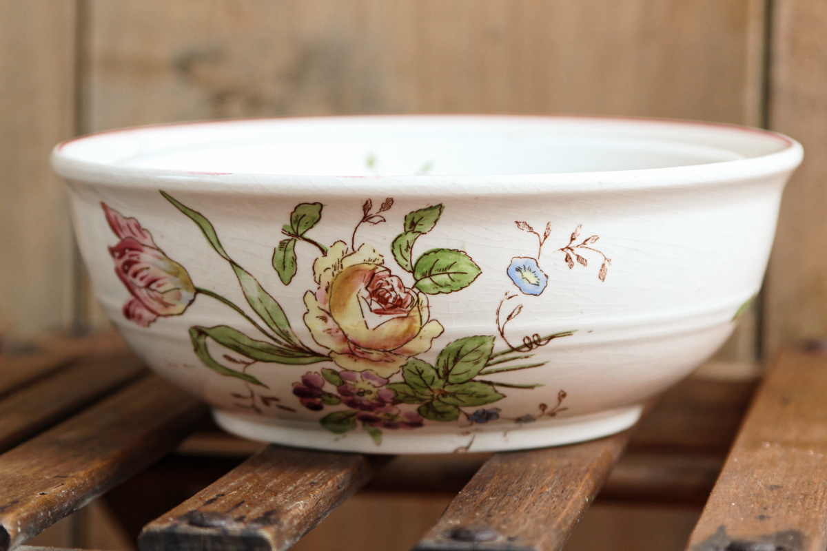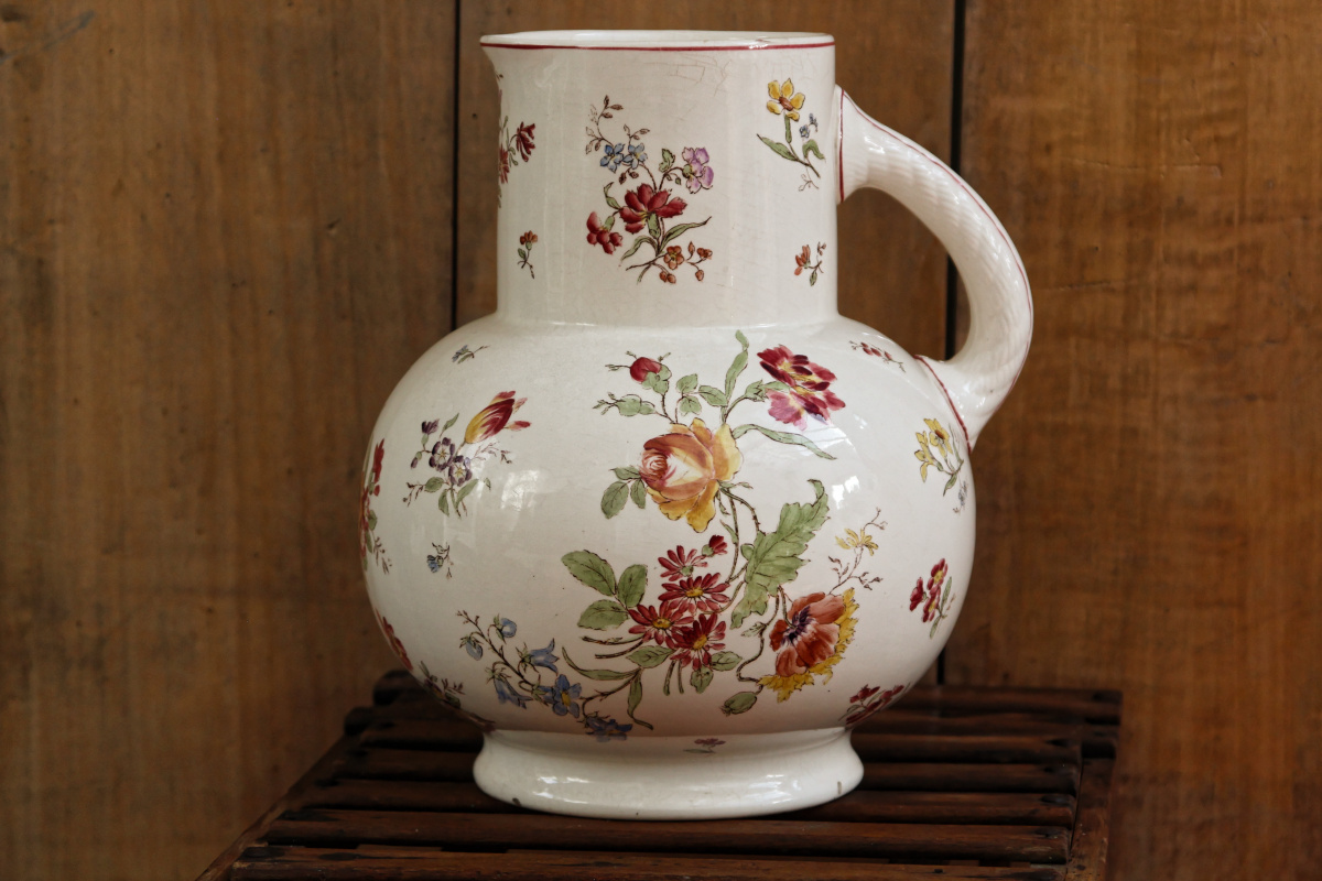 Très bel ensemble, composé de 4 éléments en faïence, aux motifs floraux d'une grande fraicheur et d'une grande finesse. Production française, quelques chocs, fêle (voir photos), qui n'enlèvent en rien la grande qualité de cet ensemble qui décorera à merveille une salle de bain, une chambre d'hôte...