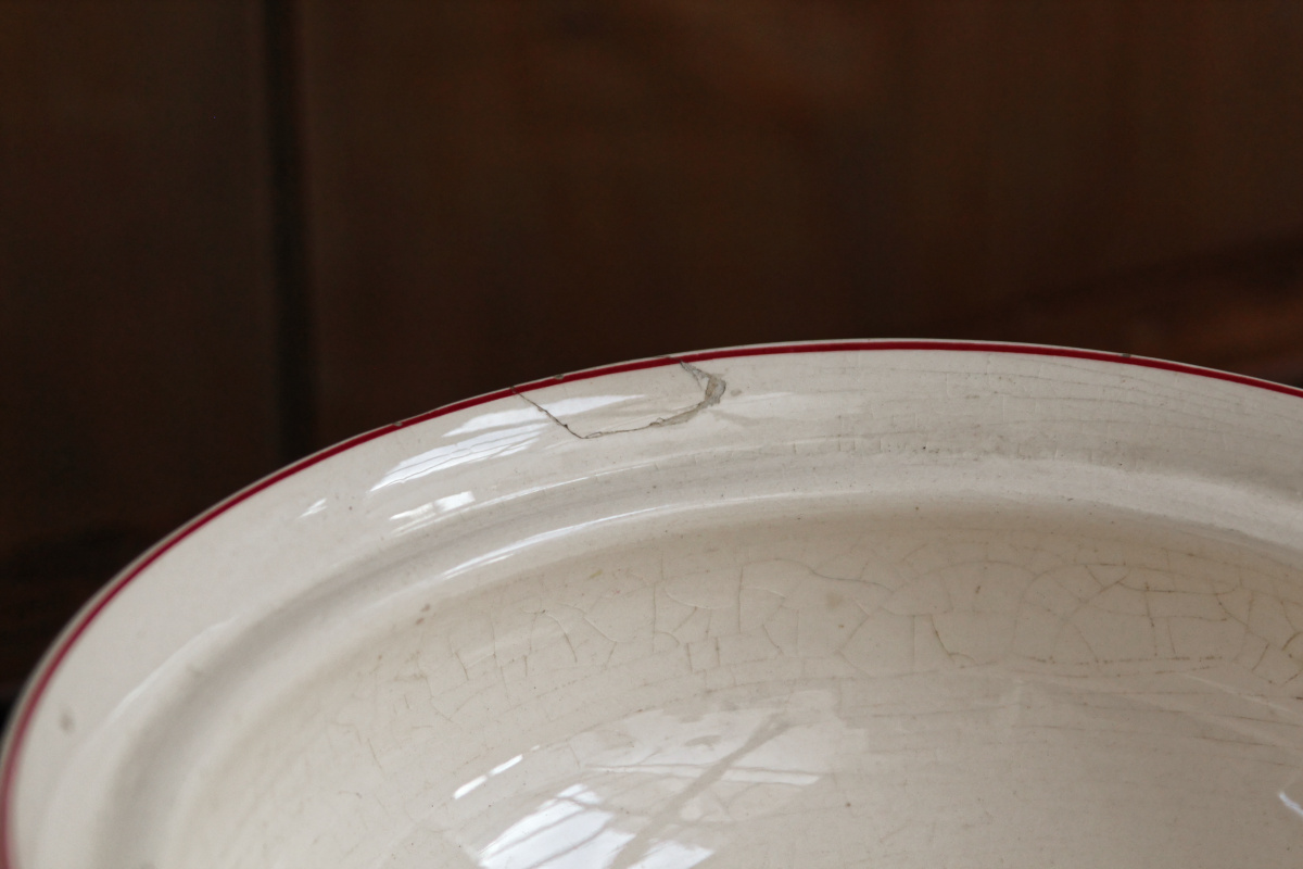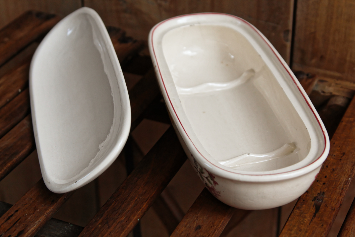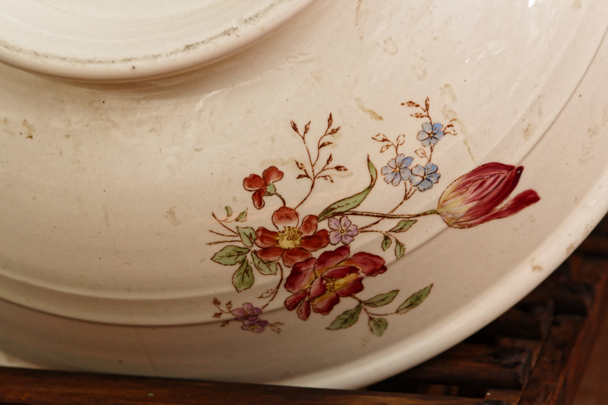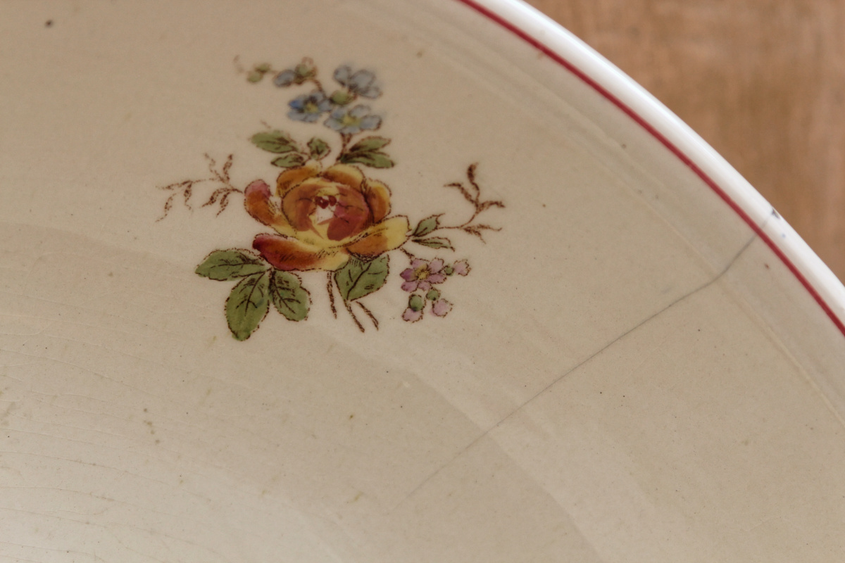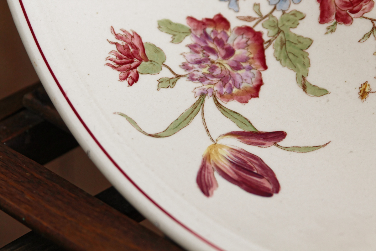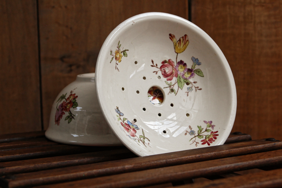 Très bel ensemble, composé de 4 éléments en faïence, aux motifs floraux d'une grande fraicheur et d'une grande finesse. Production française, quelques chocs, fêle (voir photos), qui n'enlèvent en rien la grande qualité de cet ensemble qui décorera à merveille une salle de bain, une chambre d'hôte...