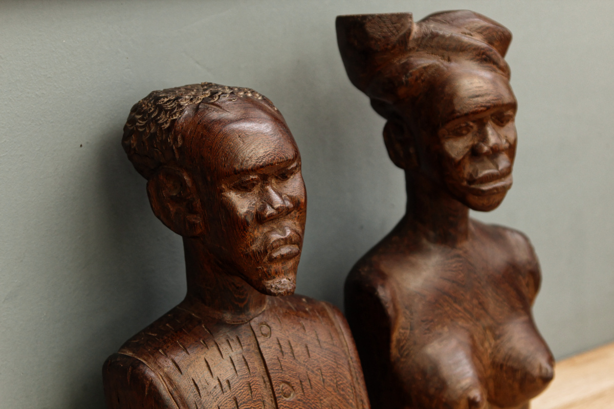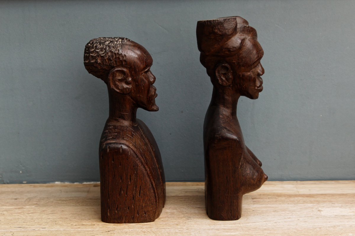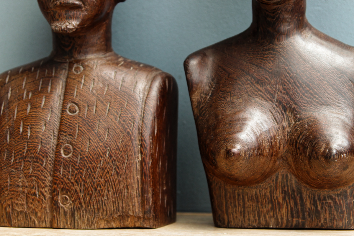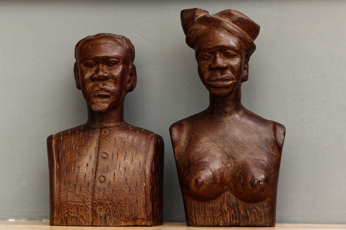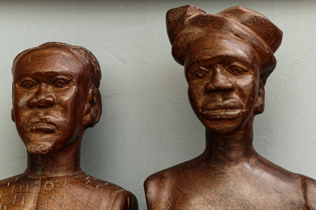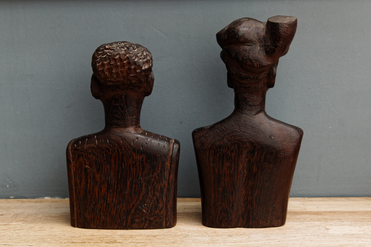 Très belle prestance pour ces deux personnages, le travail du sculpteur est affirmé, de grande maitrise, le bois est dense, de qualité. On pourrait leur trouver une place sur une étagère ou même les monter sur des socles en bois brut pour les sublimer...