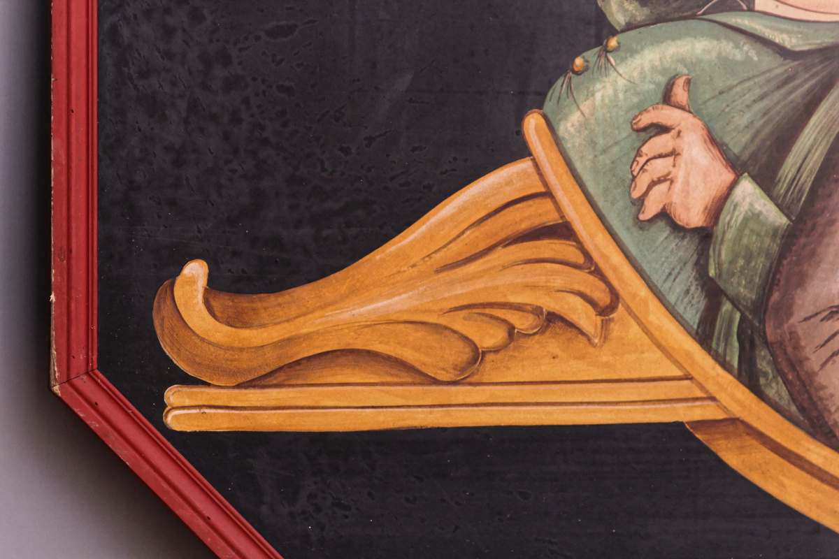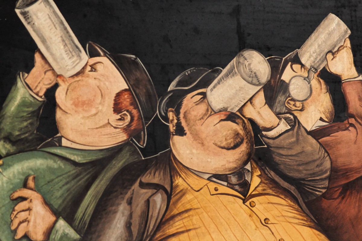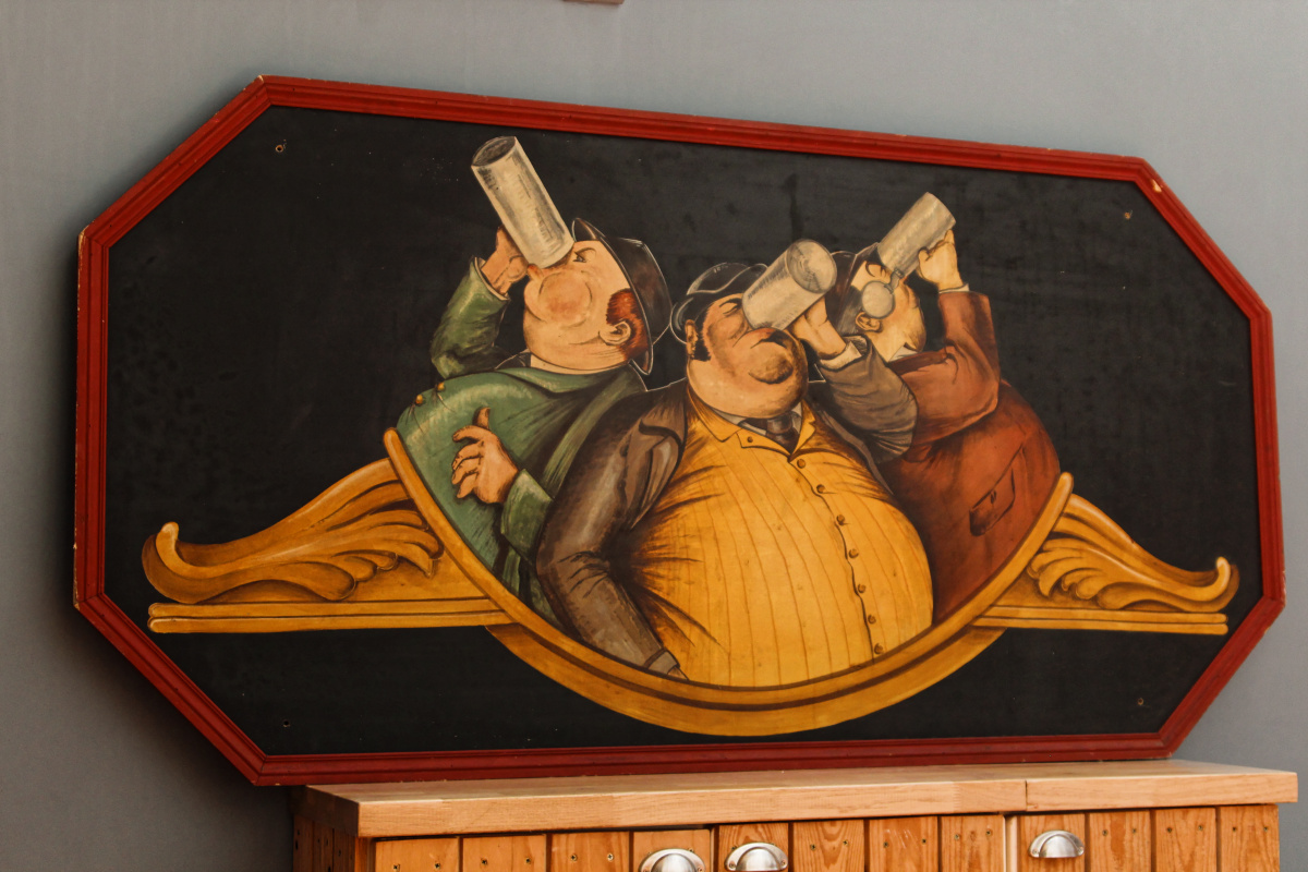 Superbe peinture sur bois, datant des années 70 et représentant 3 buveurs de bière. Une invitation au partage et à la générosité !