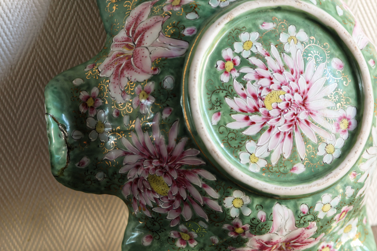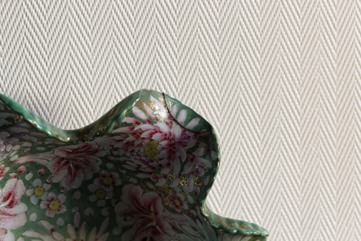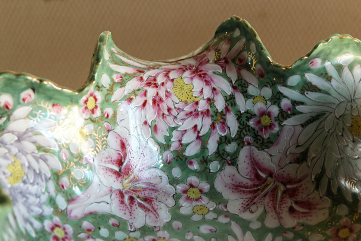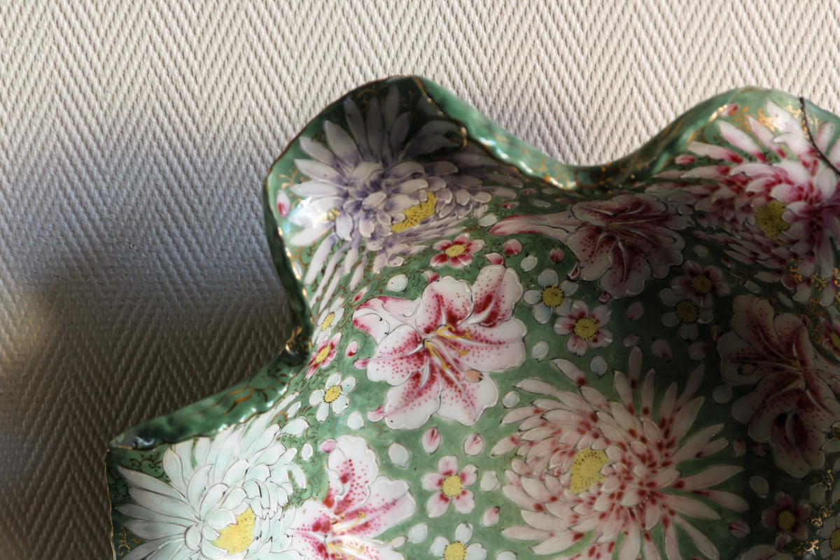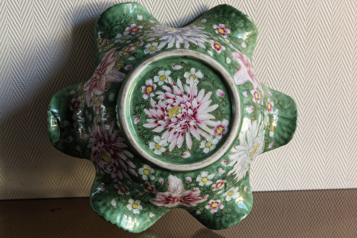 Superbe plat ancien, polylobé, en porcelaine de Chine, peint à la main, représentant des chrysanthèmes et des iris. Grande finesse dans le dessin et les couleurs. Bon état général, malgré une cassure (anciennement recollée).peu courant, un vrai coup de coeur.