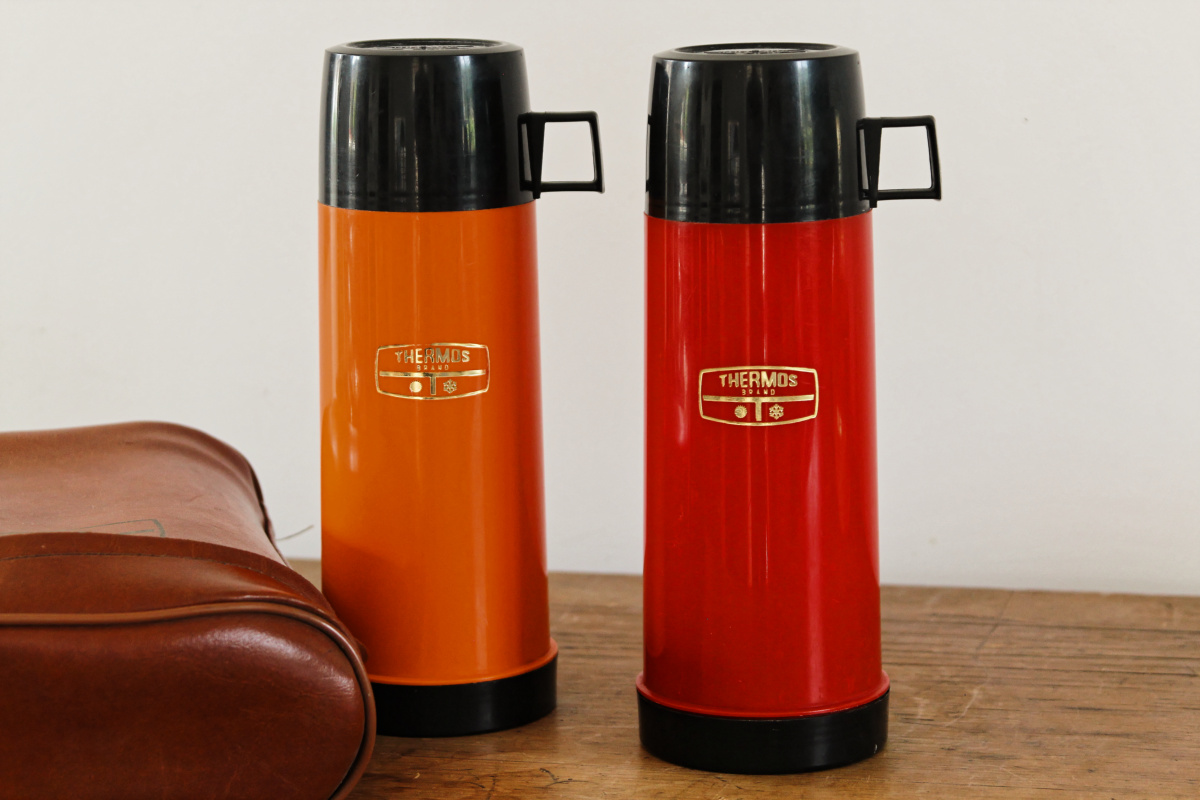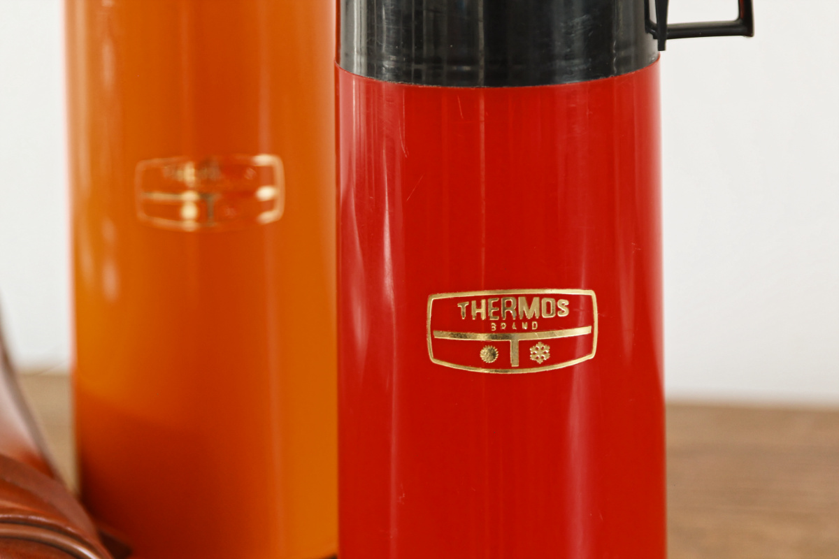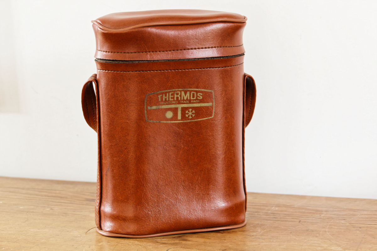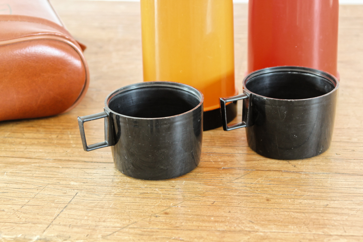Une belle pochette en moleskine, contenant deux jolis thermos et leur quarts... Un appel à l'oisiveté, à la promenade, à la pêche. Un thermos pour les liquides chaud, un autre pour le froid. Le tout en bon état général. Tellement vintage.