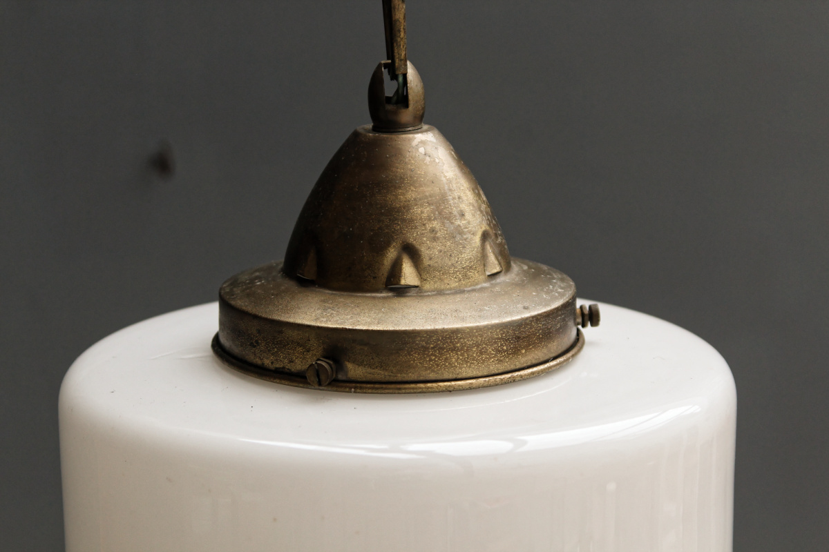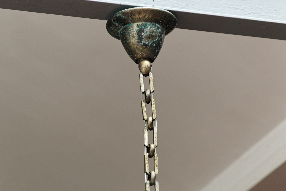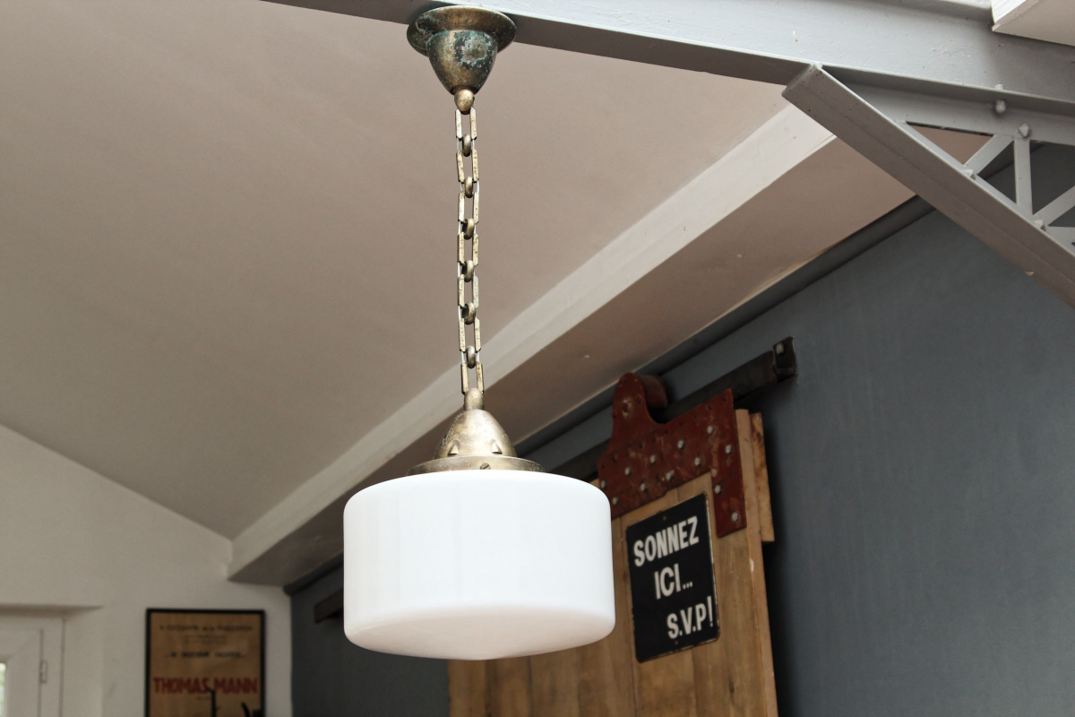 Très belle suspension art déco, chaine en mailles forçat de belle qualité, oxydation (vert de gris) qui confère à l'objet encore plus de charme. Le globe est en parfait état, l'électrification est d'origine mais fonctionnelle.