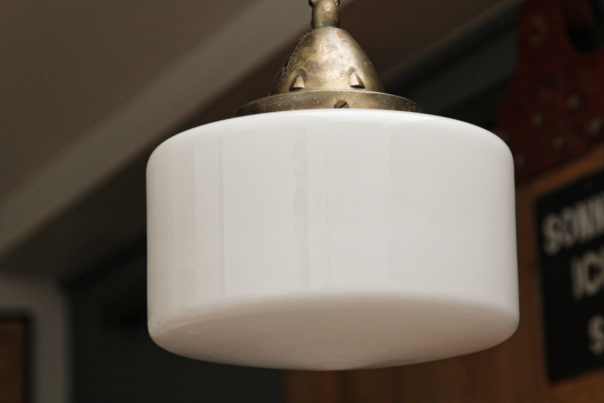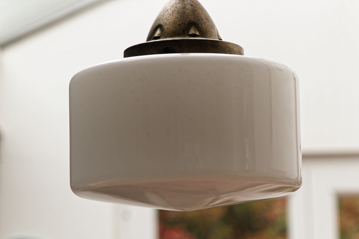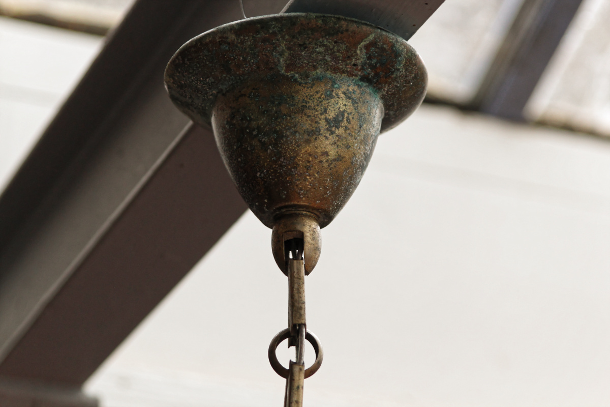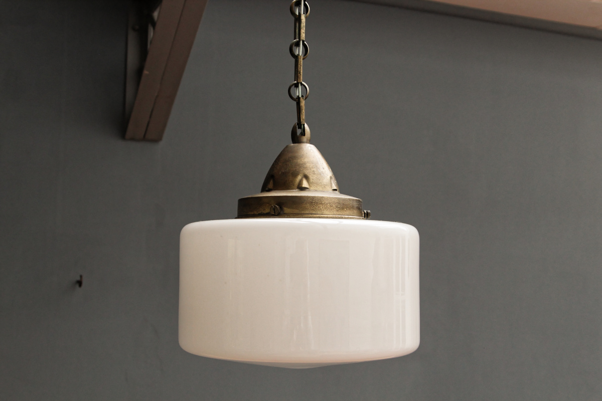 Très belle suspension art déco, chaine en mailles forçat de belle qualité, oxydation (vert de gris) qui confère à l'objet encore plus de charme. Le globe est en parfait état, l'électrification est d'origine mais fonctionnelle.
