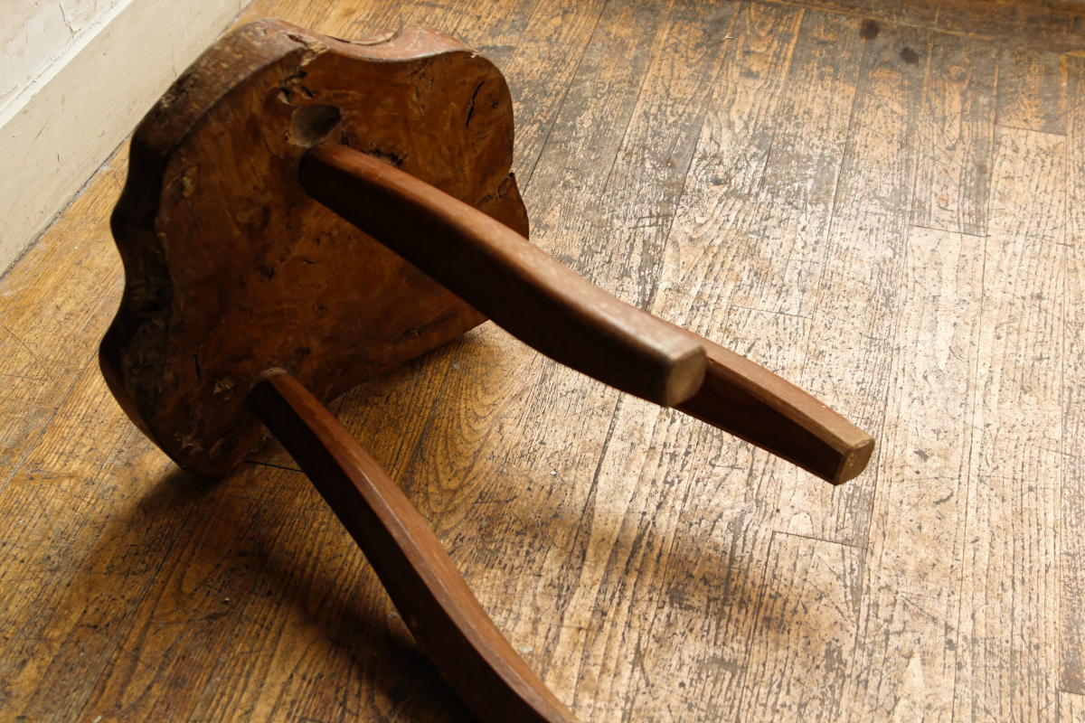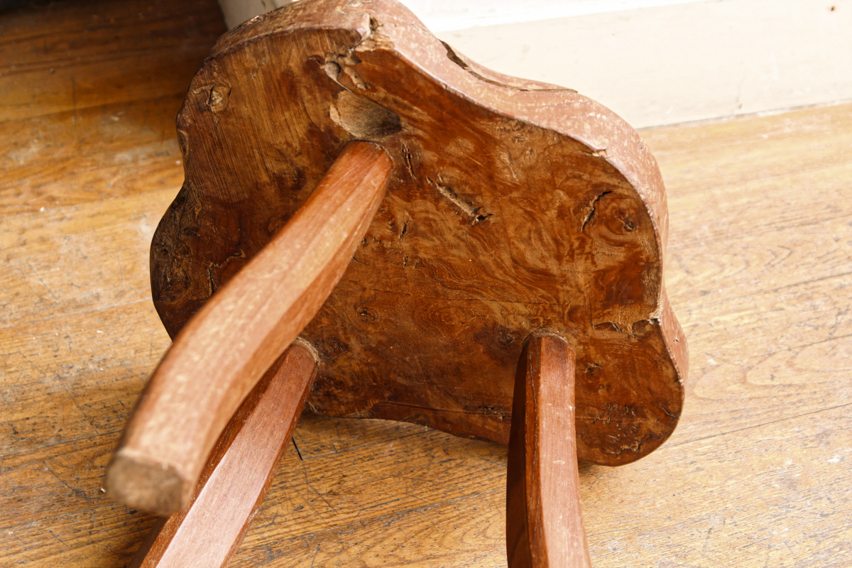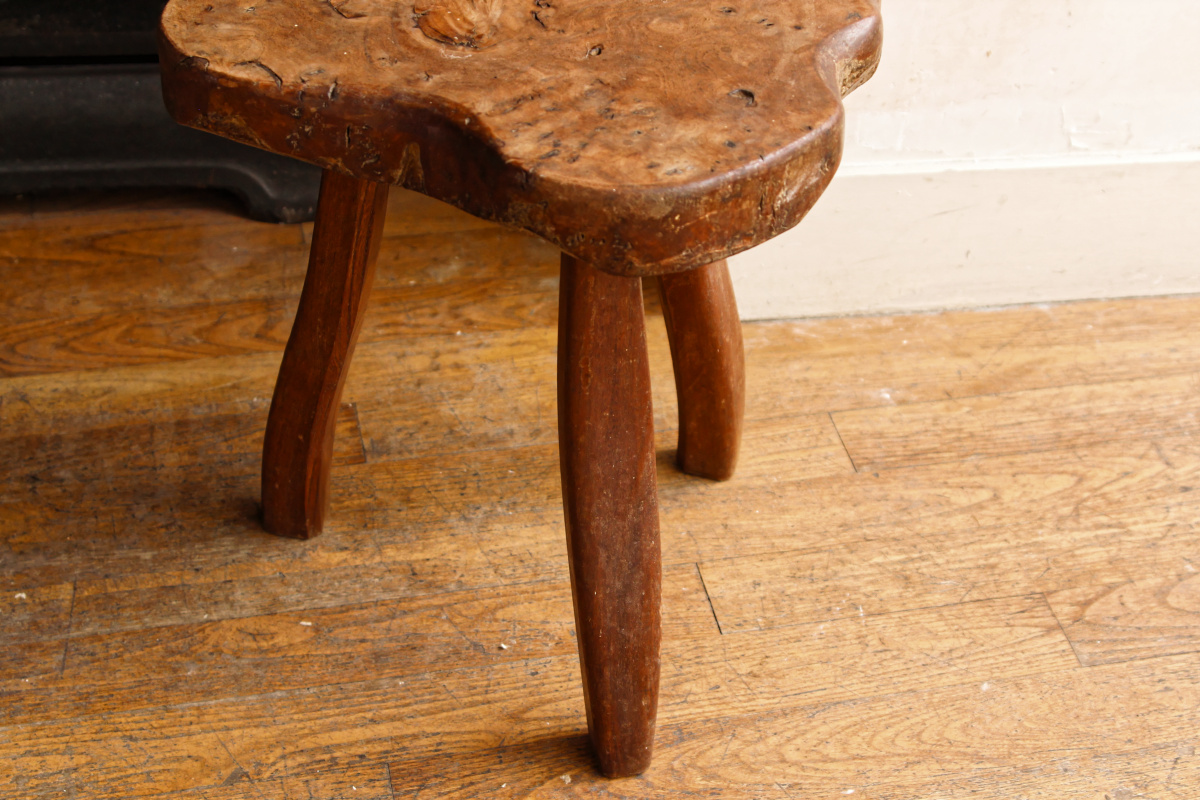 Très beau tabouret tripode en noyer massif. Bon état général, art populaire, beaucoup de charme.