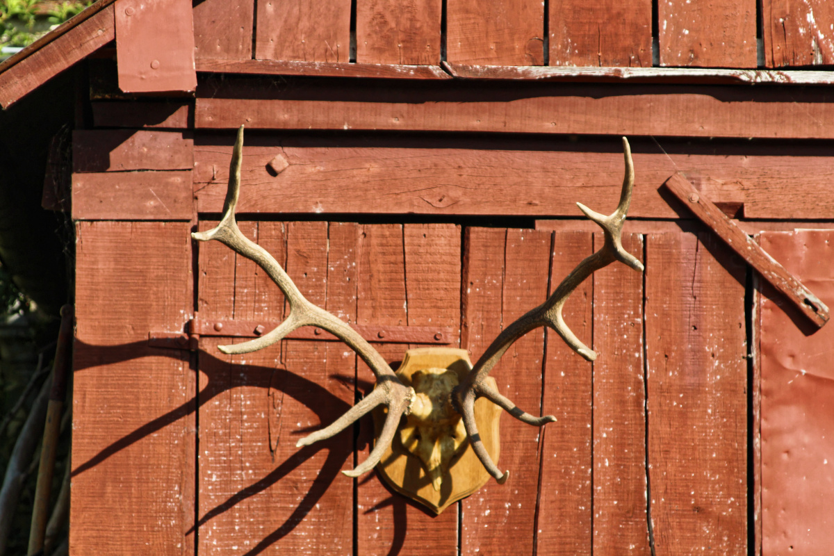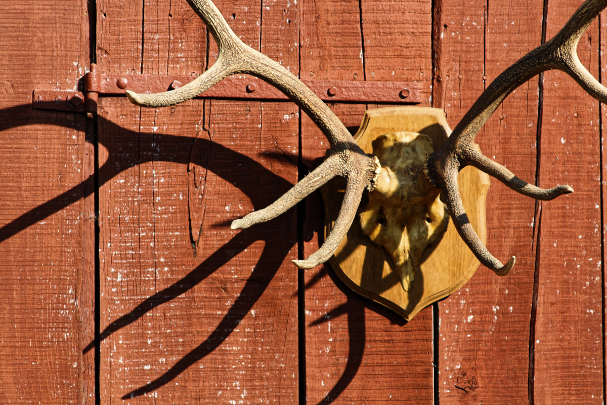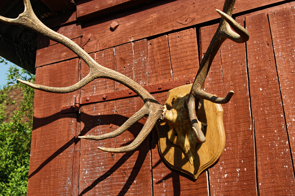 Trophée de chasse, massacre de cerf sur écusson en chêne