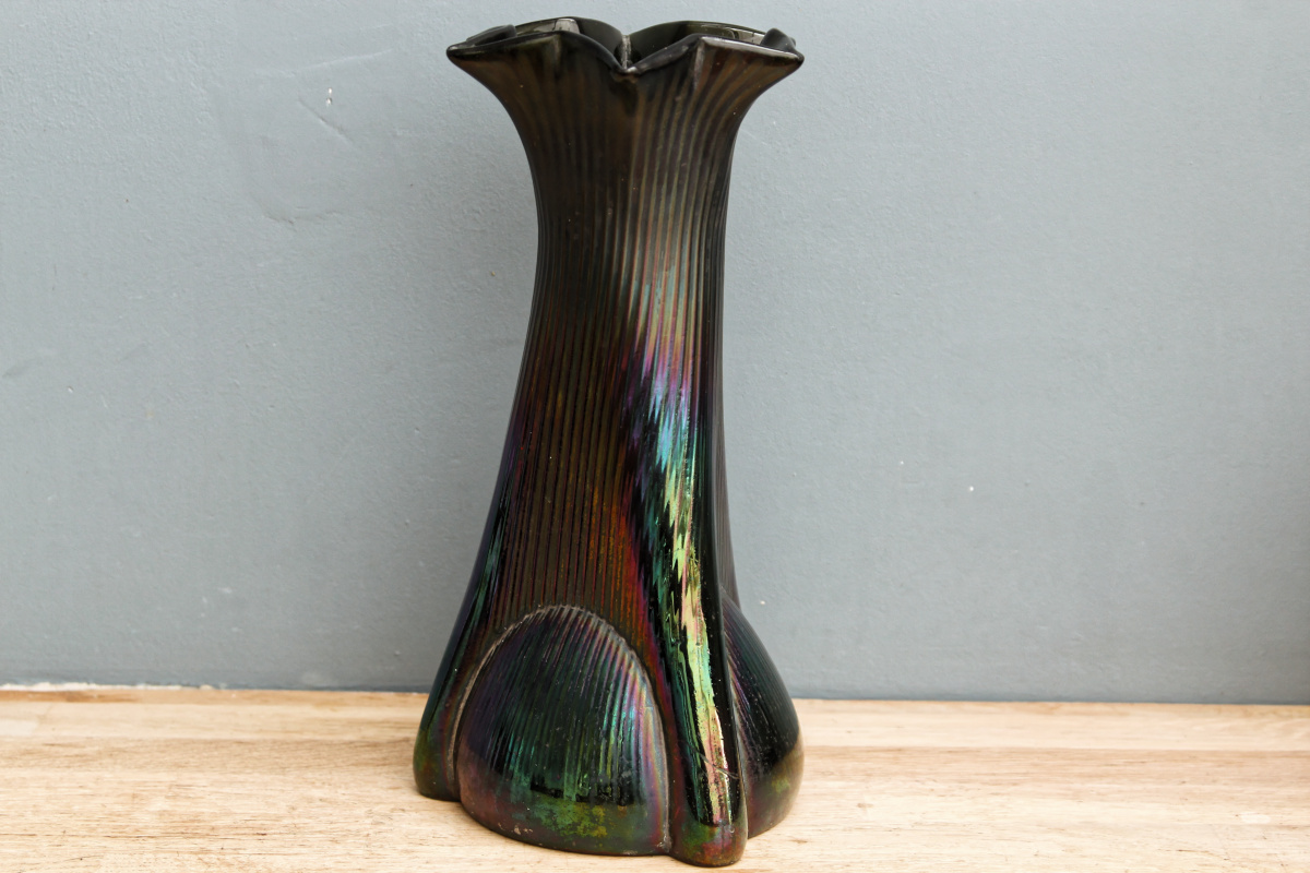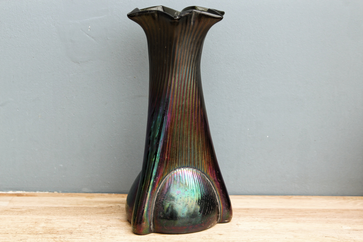 Magnifique vase en verre irisé, dans le style de Loetz, à la forme complexe. Beaucoup d'allure, bon état général, trace importante du pontil au "cul".
