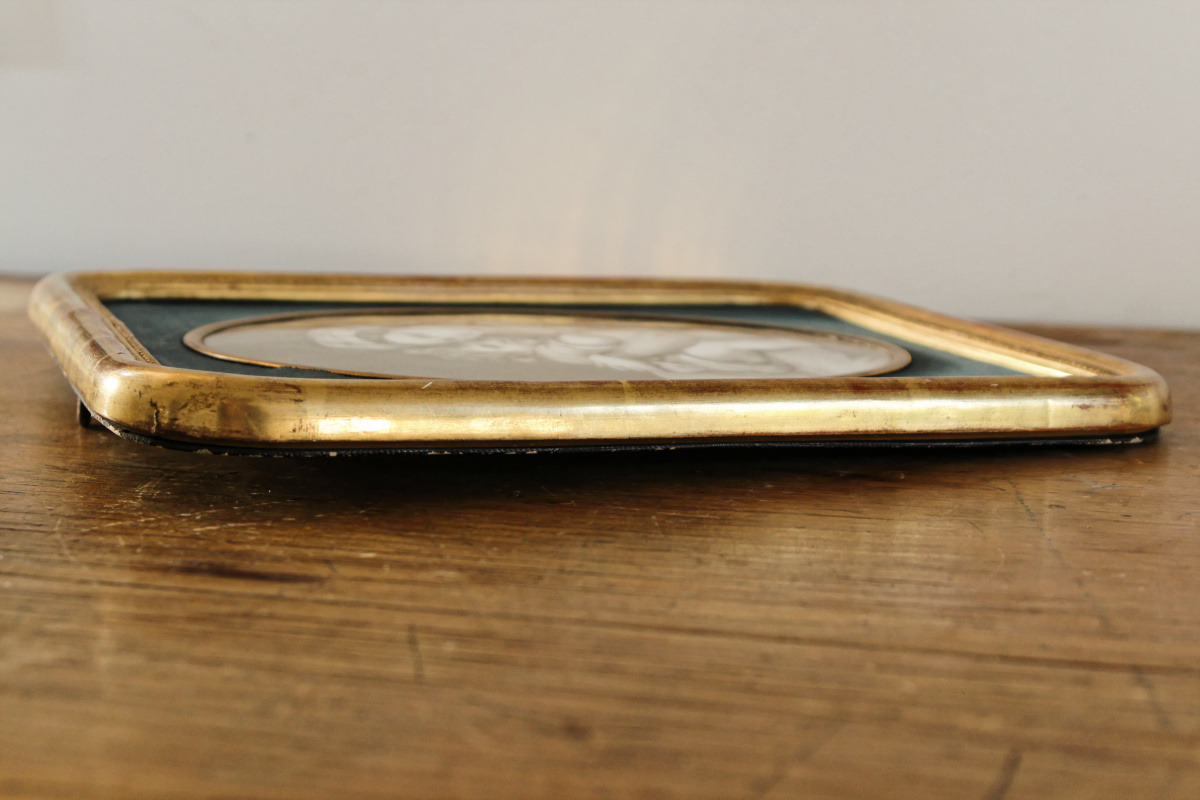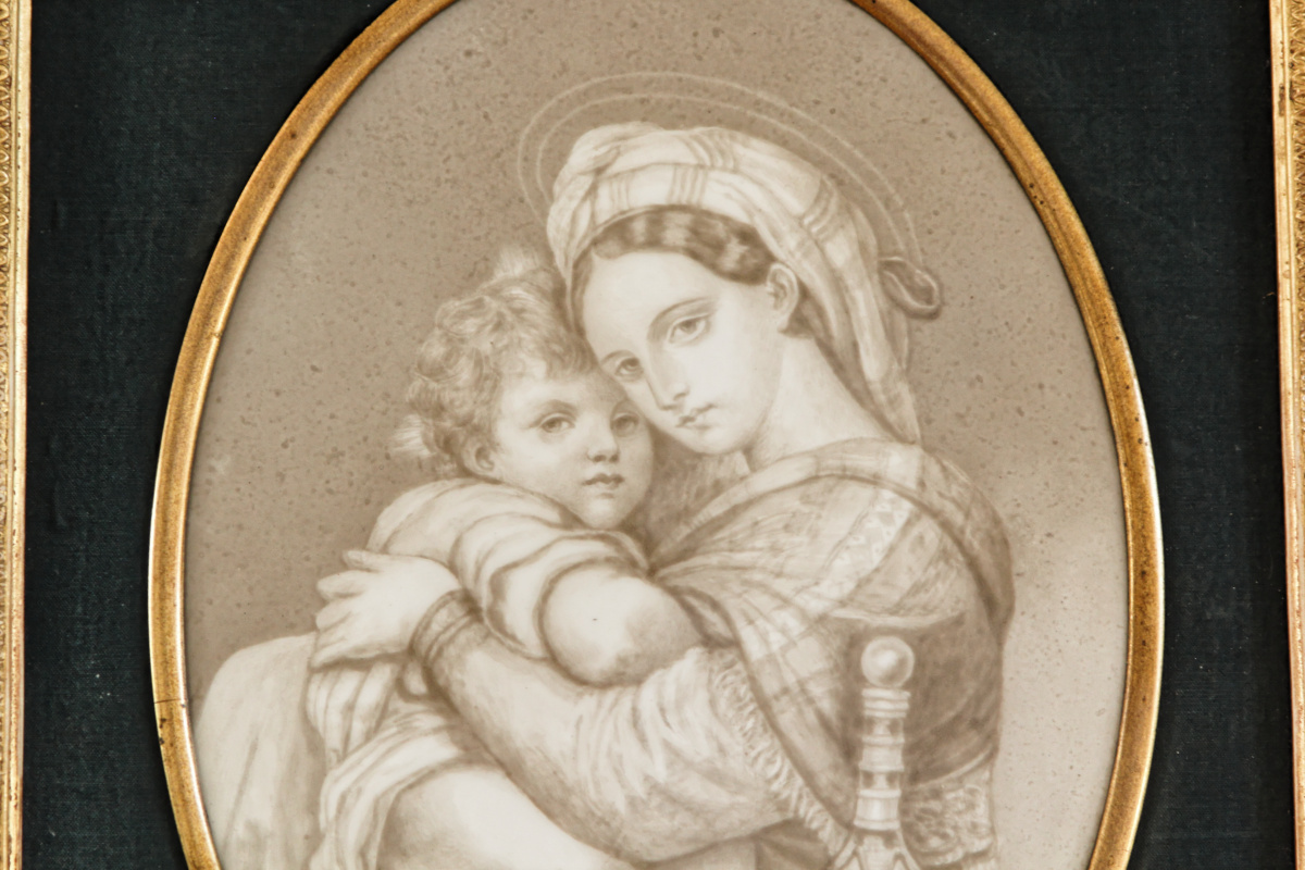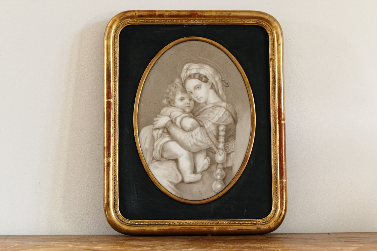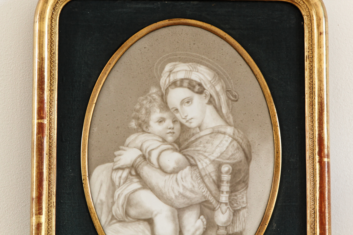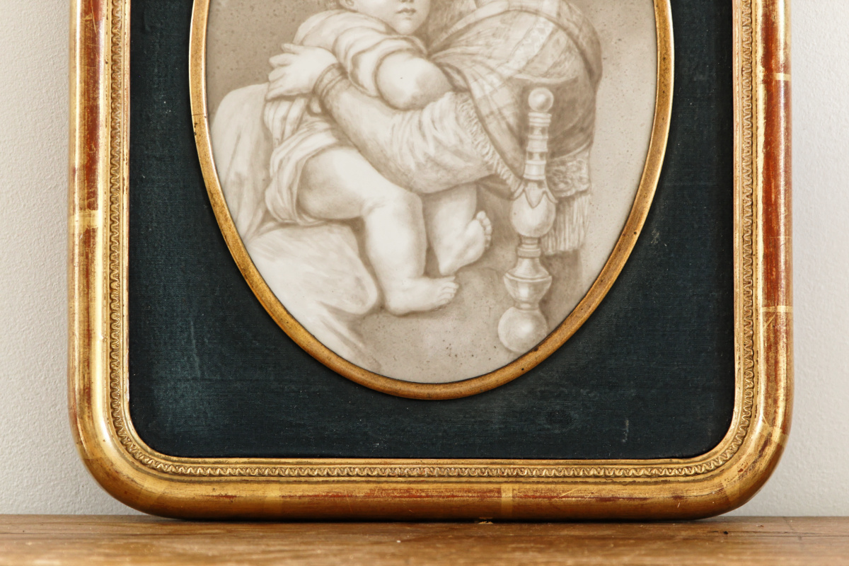 Superbe peinture sur émaux en grisaille, représentant une vierge à l'enfant. Grande finesse des traits, cadre doré à l'or fin, beaucoup d'allure.