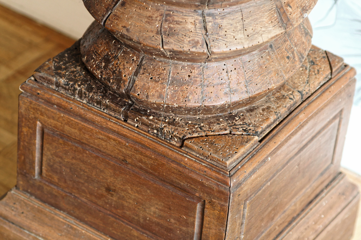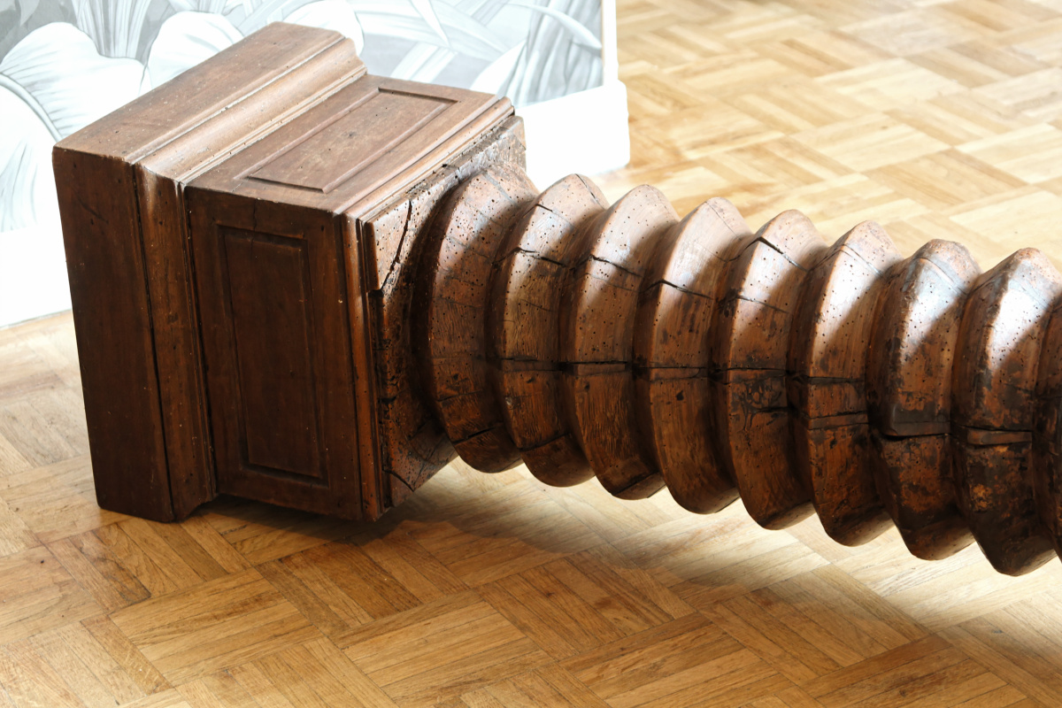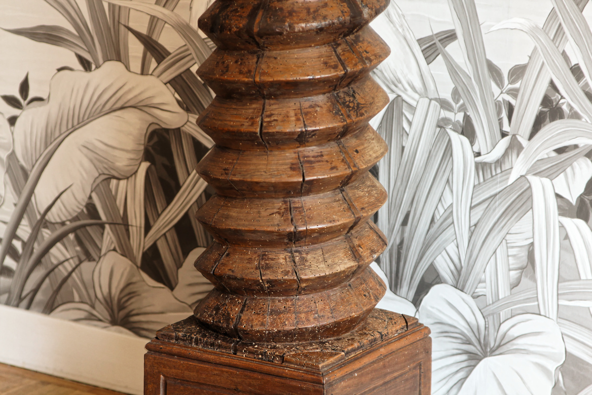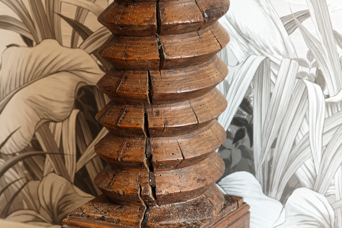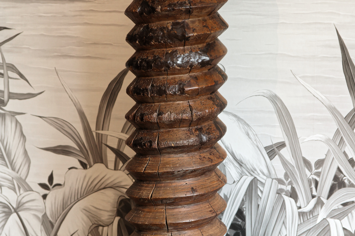 Splendide vis de pressoir en chêne, montée en sellette. La vis est du XVIIIème siècle, les socles supérieur et inférieur sont du début XXème. Le bois a été traité contre les insectes xylophages. Très belle patine du temps, riche chapiteau sculpté, excellente stabilité. Support idéal pour une importante composition florale, une sculpture...