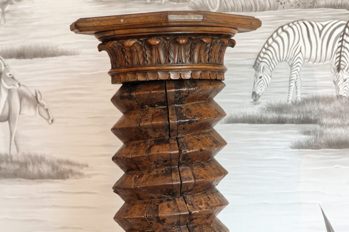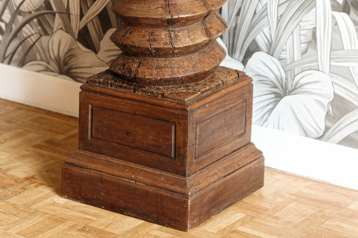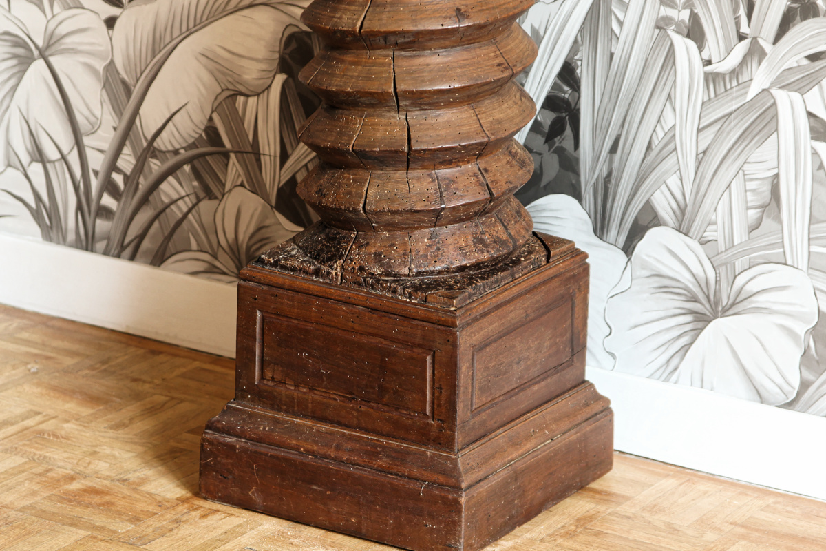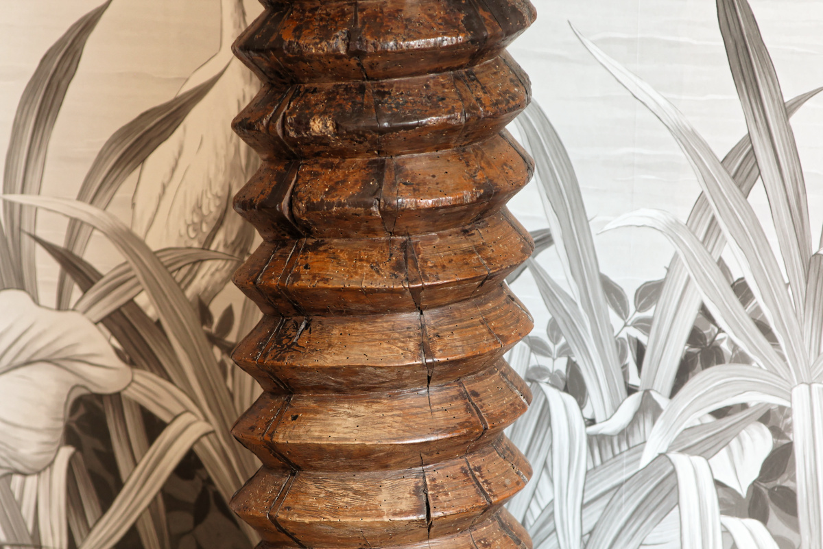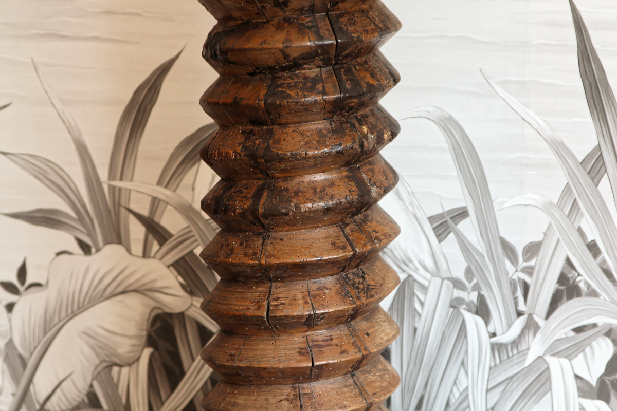 Splendide vis de pressoir en chêne, montée en sellette. La vis est du XVIIIème siècle, les socles supérieur et inférieur sont du début XXème. Le bois a été traité contre les insectes xylophages. Très belle patine du temps, riche chapiteau sculpté, excellente stabilité. Support idéal pour une importante composition florale, une sculpture...