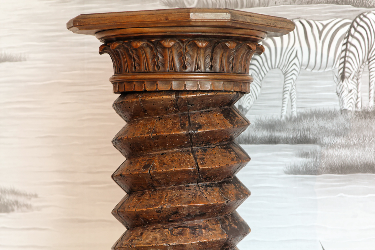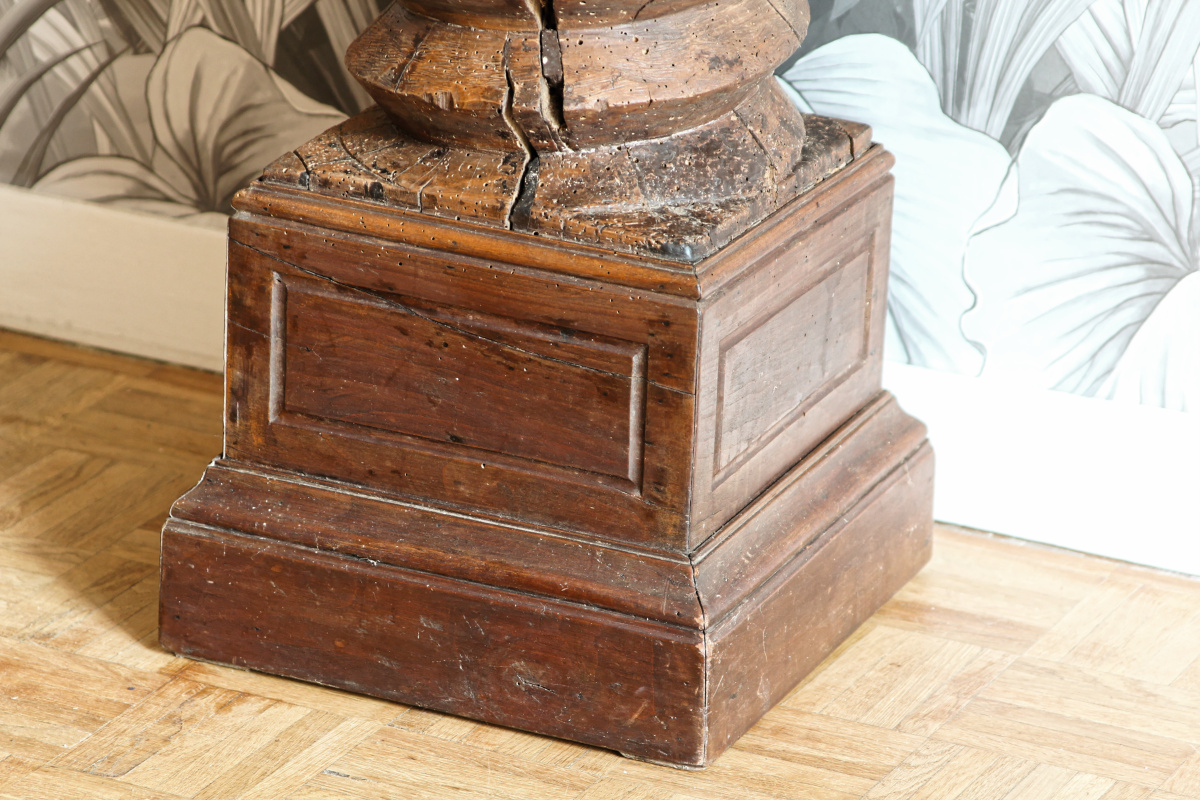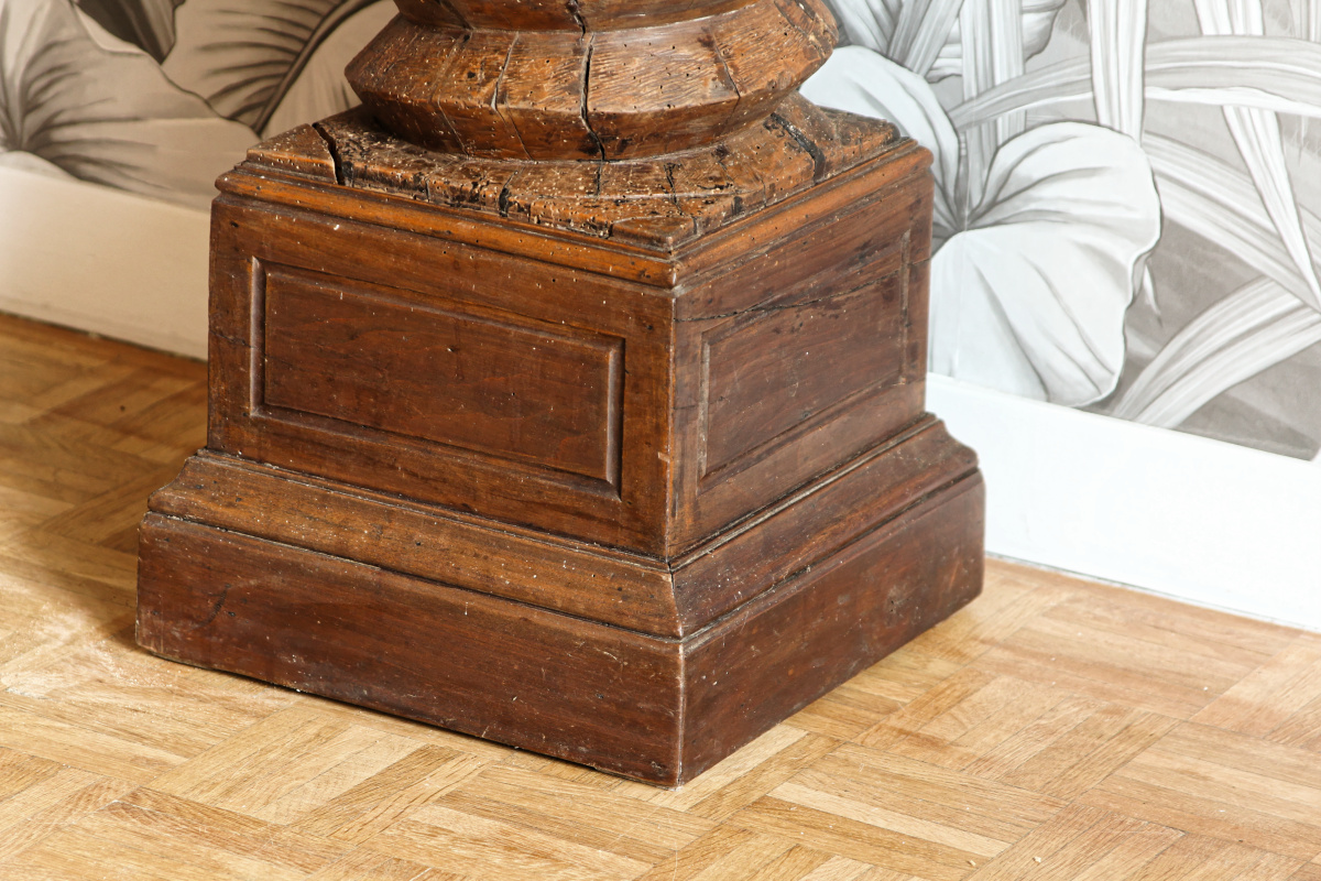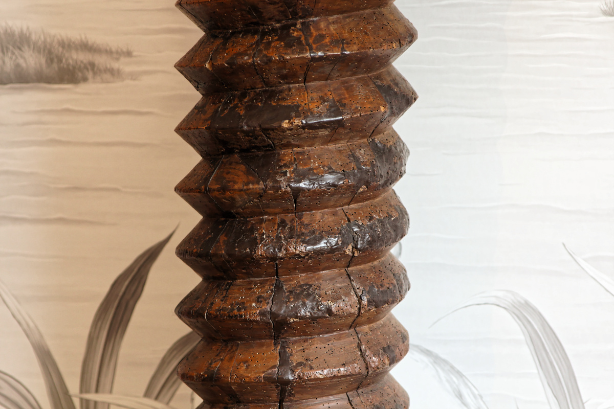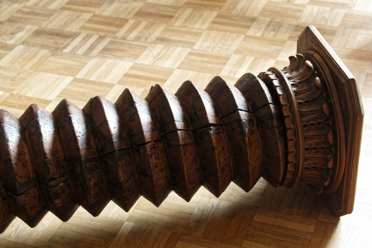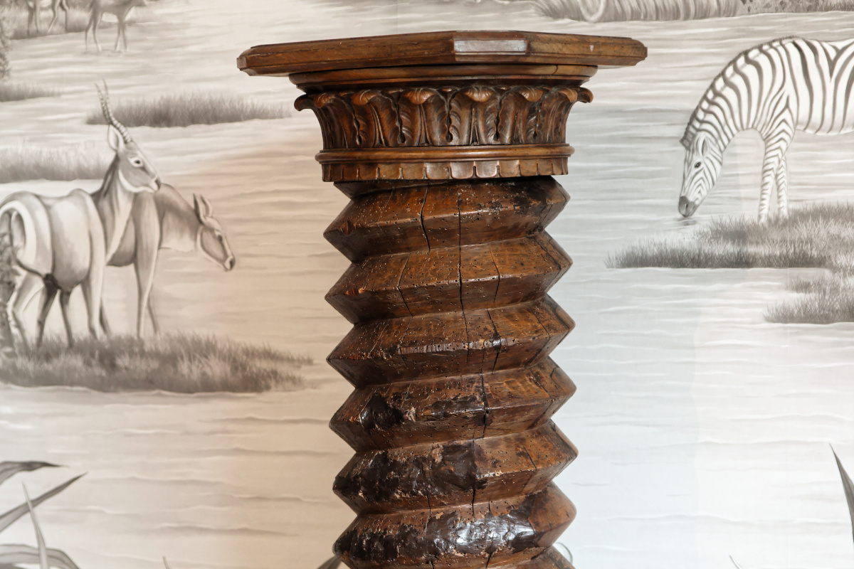 Splendide vis de pressoir en chêne, montée en sellette. La vis est du XVIIIème siècle, les socles supérieur et inférieur sont du début XXème. Le bois a été traité contre les insectes xylophages. Très belle patine du temps, riche chapiteau sculpté, excellente stabilité. Support idéal pour une importante composition florale, une sculpture...